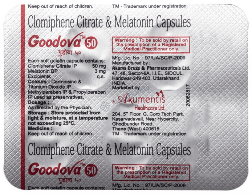 Furthermore, Goodova 50 Capsule contains a combination of Clomiphene and Melatonin, which work synergistically to address female infertility. Clomiphene helps stimulate the hormones responsible for ovulation, thereby supporting the natural reproductive process. On the other hand, Melatonin plays a vital role in protecting cells from free radicals that can lead to infertility issues. By incorporating these ingredients, Goodova 50 Capsule effectively treats female infertility by addressing both the hormonal and cellular aspects of the condition.