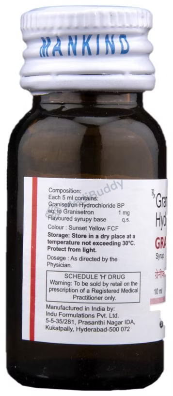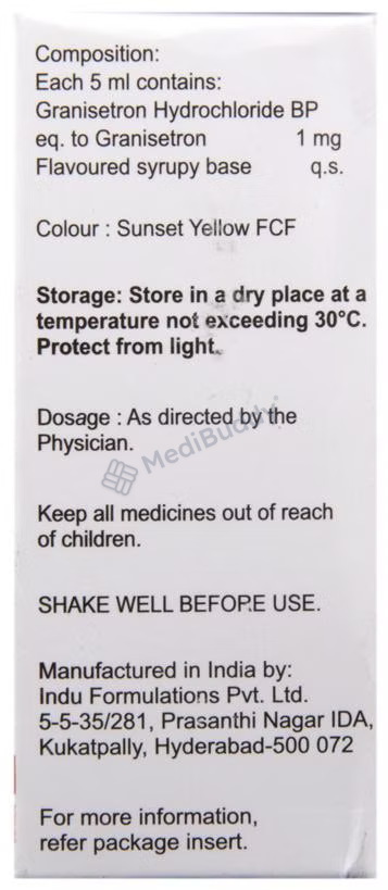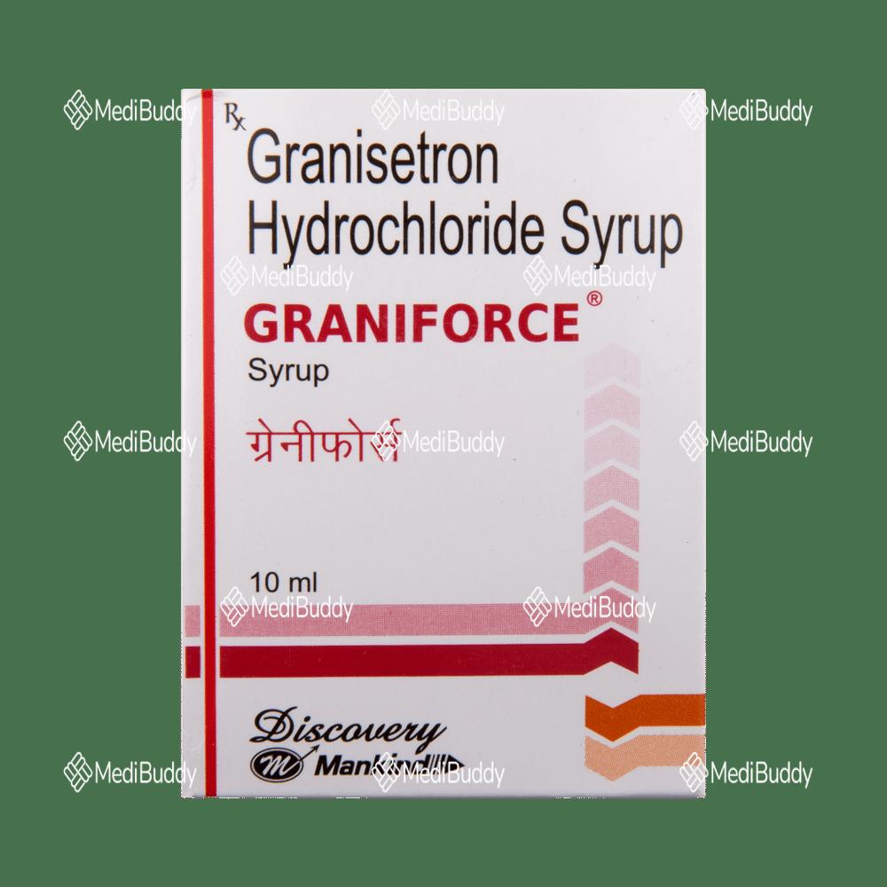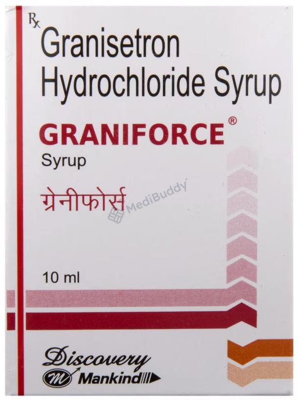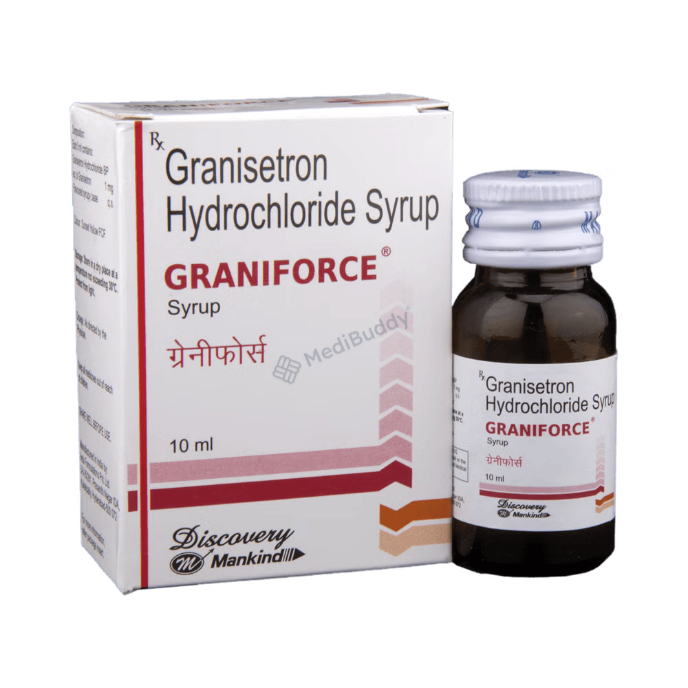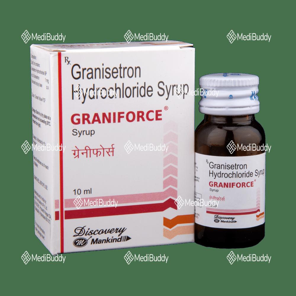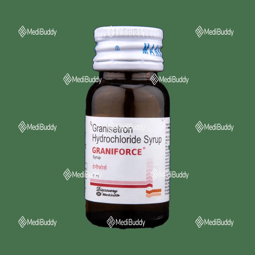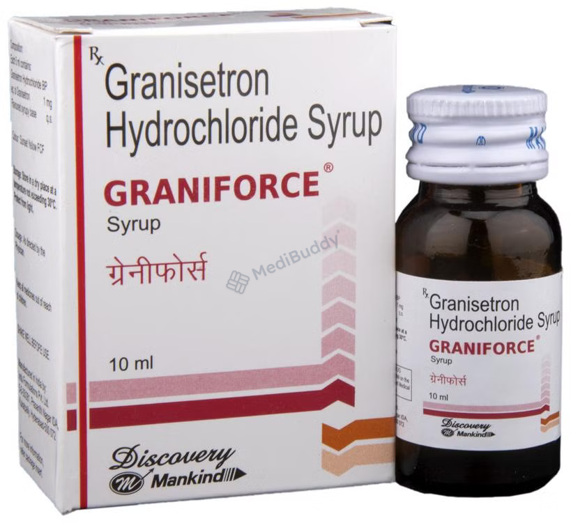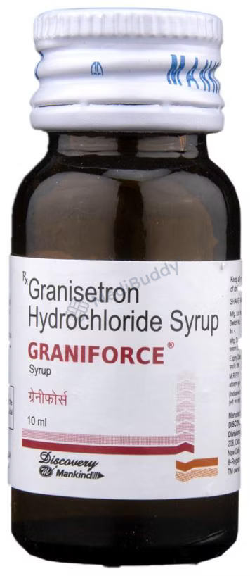 Graniforce Syrup is an antiemetic medicine mainly used for controlling nausea and vomiting resulting from surgery, cancer drug therapy, or radiotherapy. It may not alleviate other side effects of cancer treatments or vomiting due to motion sickness. Adhere to the prescribed dose and duration, taking the medicine at a consistent time. Do not stop abruptly without consulting your doctor. In case of vomiting within an hour of taking a dose, take another dose and avoid heavy meals. Common side effects include headache, constipation, diarrhea, weakness, dizziness, and sleepiness. Prior to use, inform your doctor about any existing medical conditions or medications you are taking.