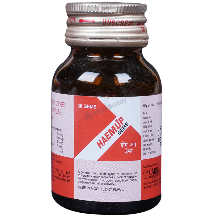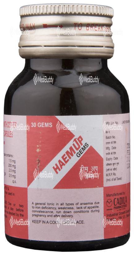 Haem UP Gems Capsule is a nutritional supplement containing iron, folic acid, manganese, and copper, which are essential for managing various types of anemia caused by iron deficiency, weakness, and lack of appetite. Suitable for use during pregnancy and post-delivery, this capsule plays a crucial role in periods of rapid cell division and growth. Both children and adults require folic acid for producing healthy red blood cells, thus preventing anemia. Additionally, copper and manganese are vital for maintaining healthy bones, nerves, and muscles.