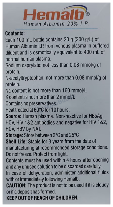 It is essential to highlight that Hemalb Infusion should only be administered under the close supervision of a healthcare professional. It is crucial to disclose any known allergies you may have to this injection to avoid any adverse reactions. Furthermore, if you are dealing with severe heart disease, it is important to inform your doctor before proceeding with this treatment.