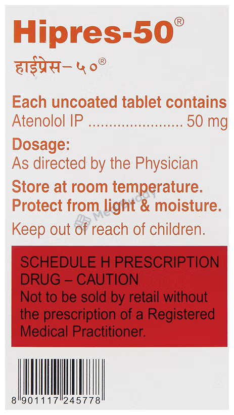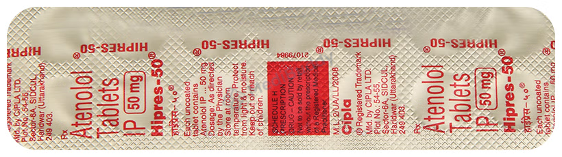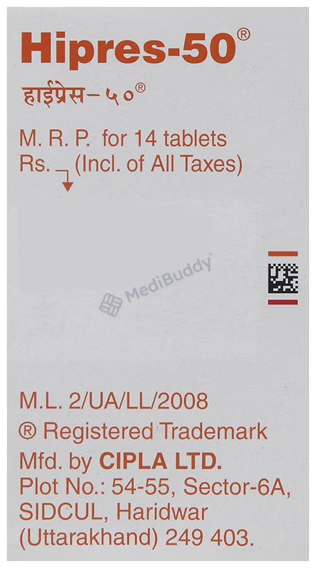 Before consuming Hipres 50 Tablet, it's important to be aware of certain precautions. This medication belongs to a group of medicines known as beta-blockers, commonly used to manage conditions such as high blood pressure, angina, irregular heart rhythms, and to prevent heart attacks and strokes. It may be prescribed alone or alongside other medications, with the dosage and frequency tailored to your specific condition. Remember to take it consistently at the same time each day for optimal results, even if you feel well.