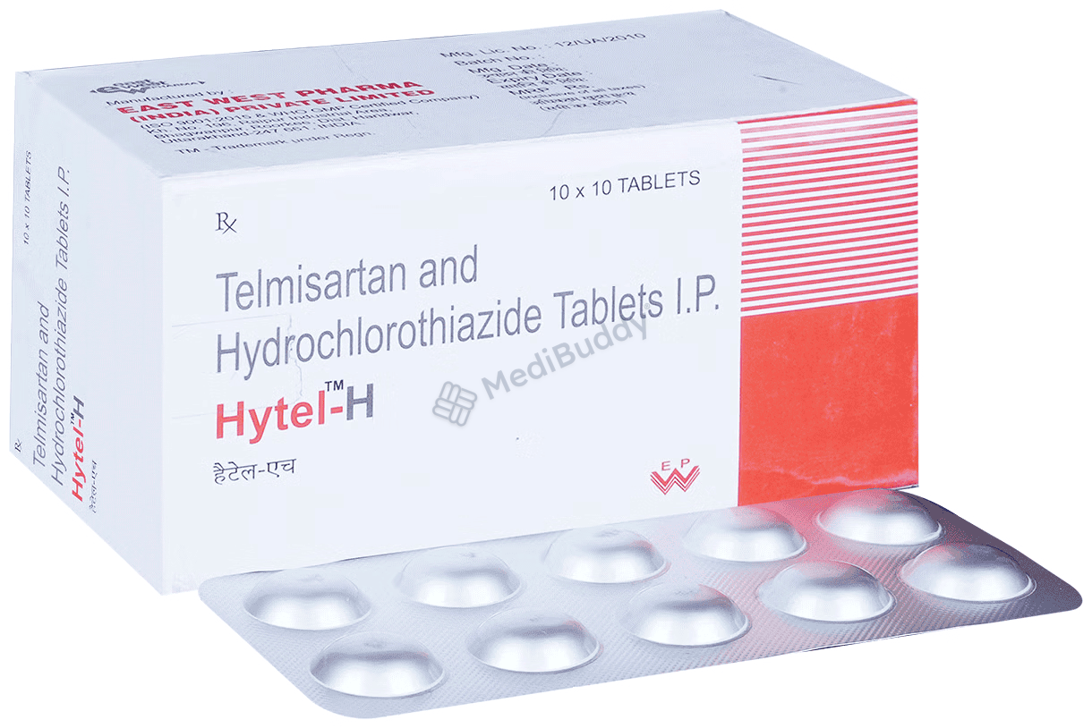 Hytel-H Tablet is used to treat high blood pressure. It contains a combination of telmisartan and hydrochlorothiazide which help control blood pressure. Telmisartan relaxes and widens blood vessels, allowing blood to flow more easily, while hydrochlorothiazide is a diuretic that increases urine output to lower blood pressure. Keeping blood pressure in check reduces the risk of heart attacks, strokes, and kidney problems. It's important to take this medicine regularly as prescribed, even if you feel fine, to maintain its effectiveness in the long term.