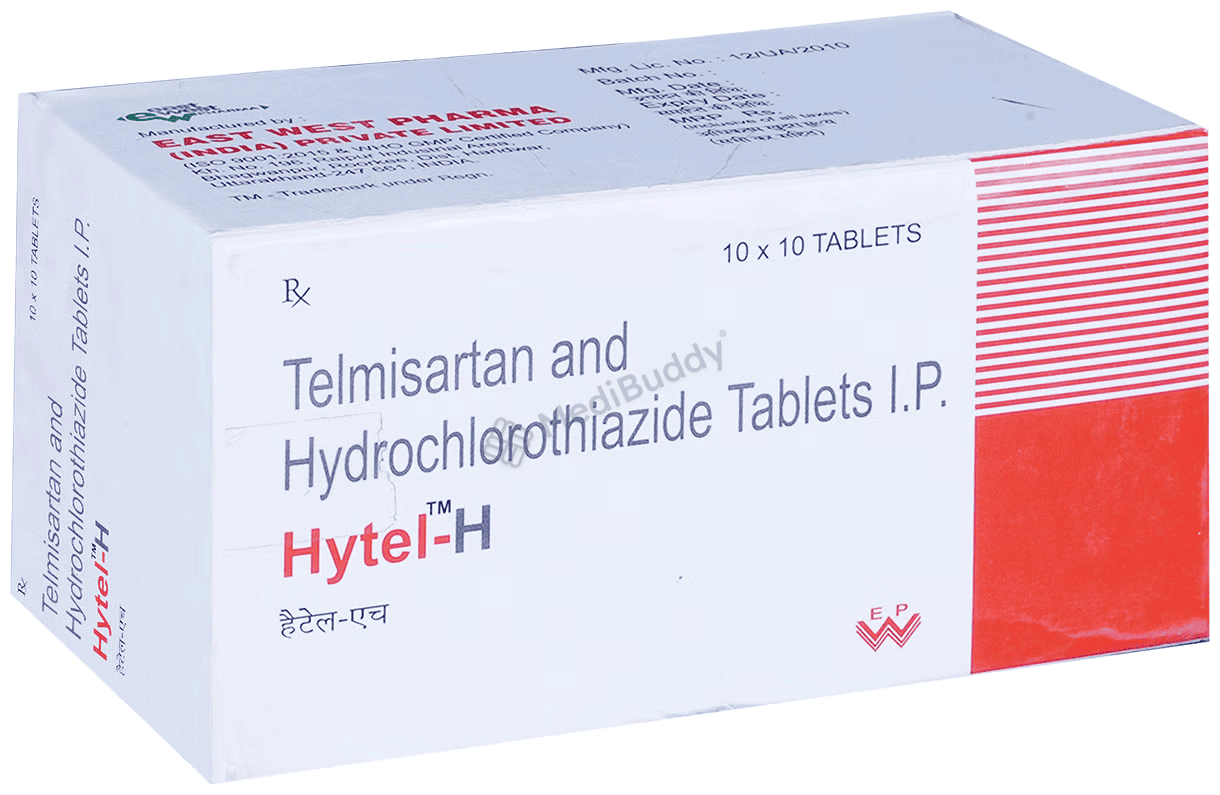 Hytel-H Tablet is a medication primarily used for treating high blood pressure, also known as hypertension. This condition occurs when the force of blood against the artery walls becomes too high, potentially leading to severe health issues like heart attacks and strokes. The tablet consists of two key medicines - Telmisartan and Hydrochlorothiazide. Telmisartan is an angiotensin receptor blocker that relaxes and widens blood vessels, while Hydrochlorothiazide acts as a diuretic, preventing salt absorption and fluid retention.