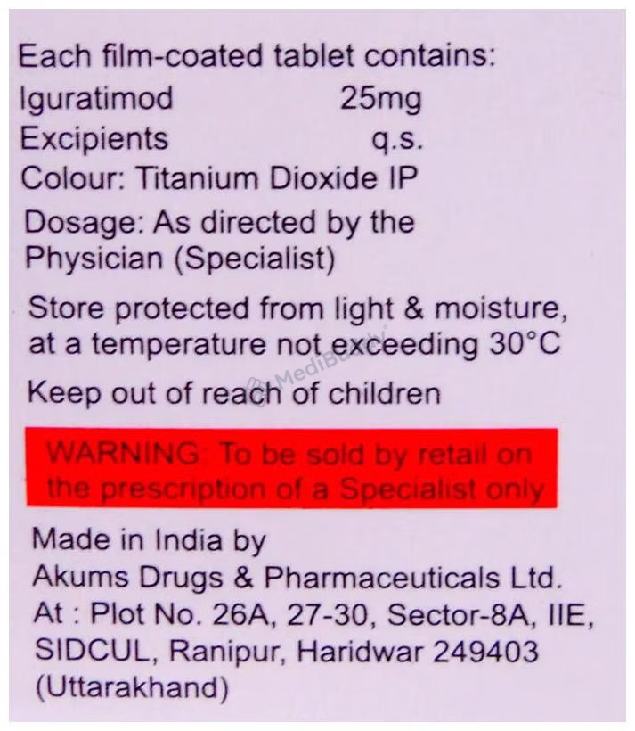 This medicine contains 'Iguratimod', which works by inhibiting the production of immunoglobulins and inflammatory cytokines, as well as inhibiting osteoclast differentiation and bone resorption while stimulating bone metabolism. Igurati 25mg Tablet provides relief from pain and inflammation by inhibiting cyclooxygenase-2, an enzyme responsible for causing pain and inflammation in the body.