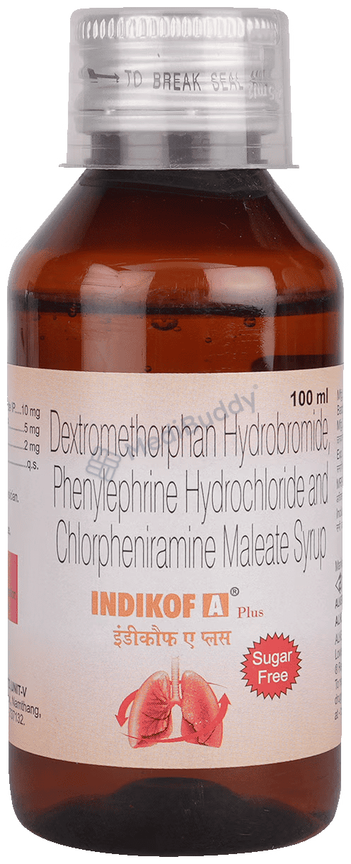 Indikof A Plus Syrup is a medication used to treat common cold and cough symptoms such as runny nose, stuffy nose, sneezing, watery eyes, and congestion. It provides quick relief from these discomforts. The syrup is taken as per the doctor's instructions, with or without food, depending on the individual's condition and response to the medication. It is essential to complete the full course of treatment as stopping early may lead to symptoms returning or worsening. Inform your healthcare provider about all other medications you are taking to avoid any interactions.