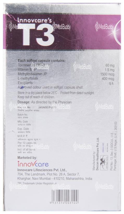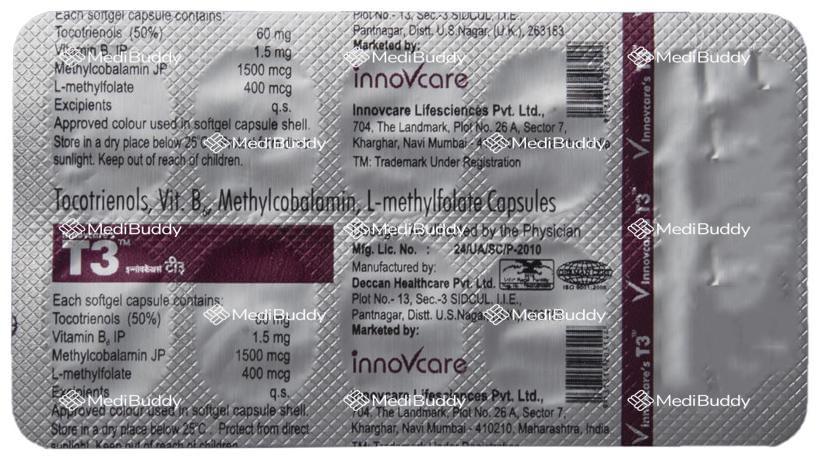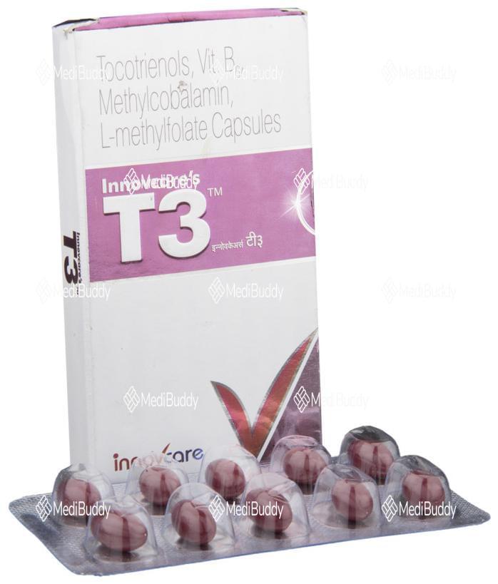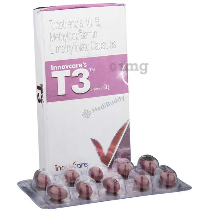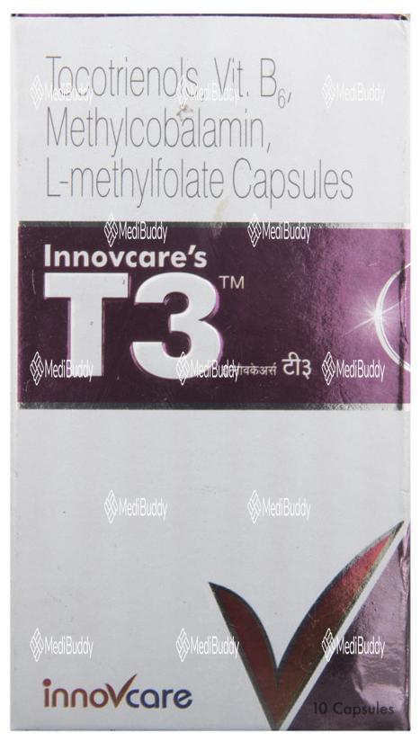 Innovcare's T3 Capsule is a health supplement containing a unique combination of active ingredients aimed at promoting neurological health and serving as an adjuvant therapy. The key ingredients in T3 Capsule include Tocotrienols, Vitamin B6, Methylcobalamine, and L-Methyl Folate, each offering specific benefits to the body. This capsule is specially formulated to support individuals dealing with neurological disorders or seeking to improve their overall health through supplementation.