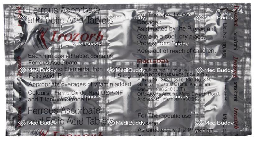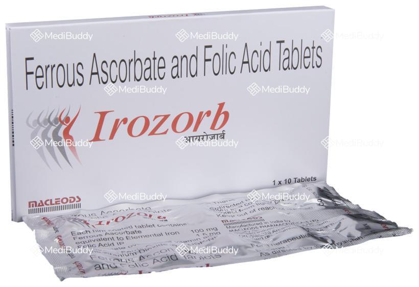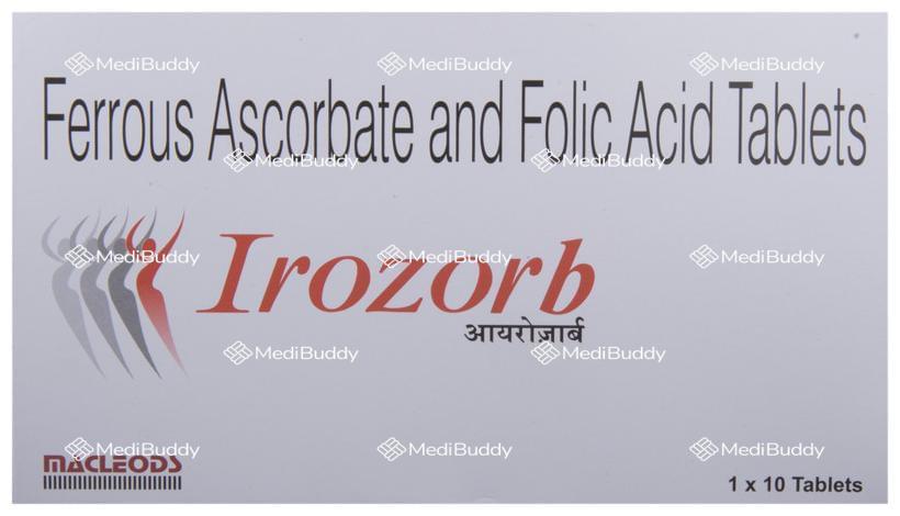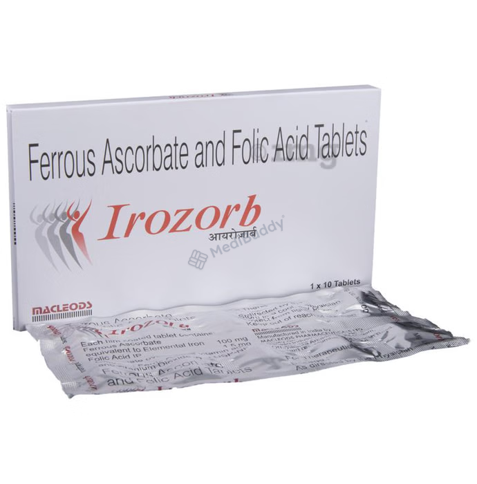 Irozorb Tablet belongs to the class of medications known as 'haematinics,' primarily utilized for treating anaemia caused by factors such as poor diet, inadequate food absorption, or increased folate use during pregnancy. Anaemia is a condition where the body lacks sufficient red blood cells to adequately distribute oxygen to various tissues. Irozorb Tablet 10's combines Ferrous ascorbate and folic acid to enhance red blood cell and haemoglobin production, ensuring ample oxygen supply to every tissue. Follow your doctor's recommended dosage instructions when taking Irozorb Tablet 10's and be aware of possible side effects such as nausea, vomiting, upset stomach, or dark-colored stool.