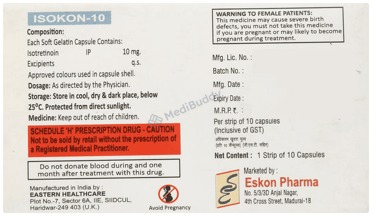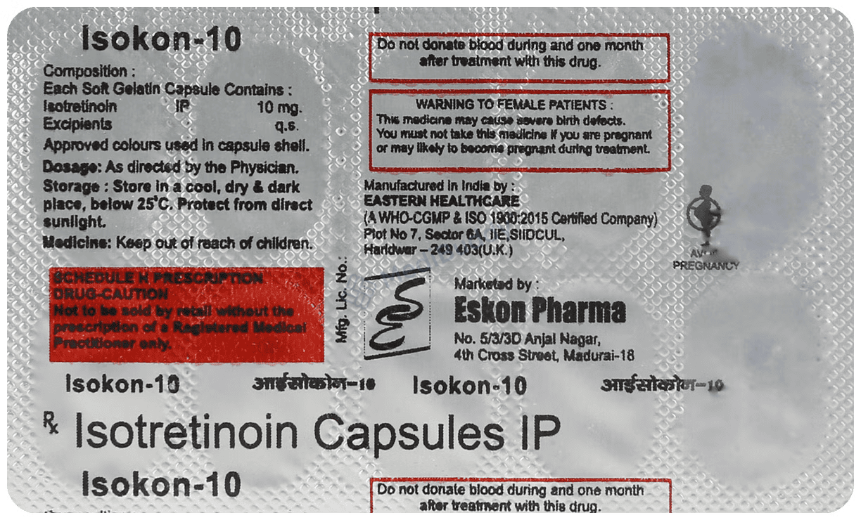 Before consuming Isokon 10mg Capsule, it is essential to heed certain warnings for your wellbeing. This medication falls under the category of retinoids, which are derived from vitamin A and primarily used to tackle severe acne that has not responded to alternative treatments. When taking Isokon 10mg Capsule, adhere strictly to the prescribed dosage and duration as directed by your physician. To minimize the risk of missing a dose, consume it alongside food, preferably at the same time daily. Do note that it might take a few weeks for noticeable improvement in your symptoms; thus, continue the medication regularly for optimal results. In the event of minimal improvement after weeks of use, consult your doctor for further guidance.