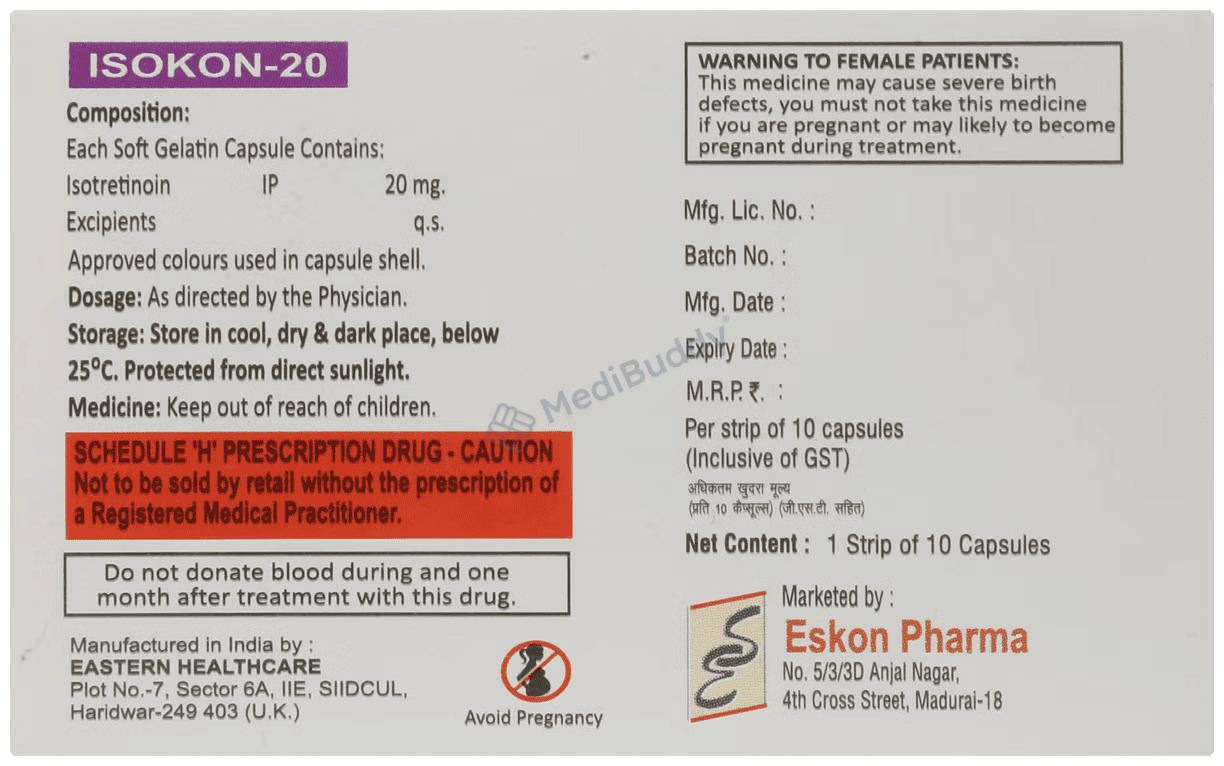 When using Isokon 20mg Capsule, always adhere to your doctor's prescription regarding dosage frequency and duration. Potential side effects such as chapped lips, skin dryness, and eye discomfort may occur but usually resolve over time without medical intervention. Inform your doctor if you are allergic to Isokon 20mg Capsule or any other drugs. Refrain from taking Isokon 20mg Capsule if pregnant or breastfeeding as it may harm the baby. In the event of depressive symptoms or suicidal thoughts while on or after discontinuing Isokon 20mg Capsule, seek medical advice promptly. Sun exposure should be limited during treatment to avoid skin sensitivity and sunburn, with protective clothing and sunscreen recommended for outdoor activities.