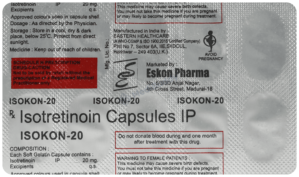 Before taking Isokon 20mg Capsule, it's important to note a few warnings. If you are pregnant or breastfeeding, it is advised not to consume this medication as it could harm the baby. If you experience depression or have suicidal thoughts while on Isokon 20mg Capsule or after stopping the treatment, seek advice from a healthcare provider. To prevent skin sensitivity to sunlight, avoid prolonged sun exposure while using this medication. It is recommended to wear protective clothing and use sunscreen to shield your skin from sunburn. Refrain from undergoing any cosmetic procedures while taking Isokon 20mg Capsule and for at least 6 months post-treatment as it may lead to increased scarring risk. Inform your doctor about any existing conditions like asthma, diabetes, high vitamin A levels, liver or heart problems, weak bones, anorexia nervosa, mental health issues, or depression before starting Isokon 20mg Capsule.