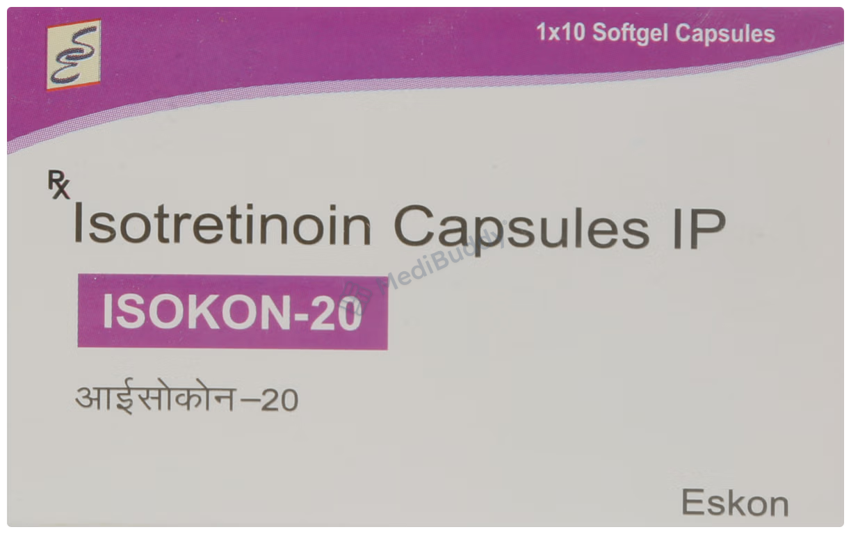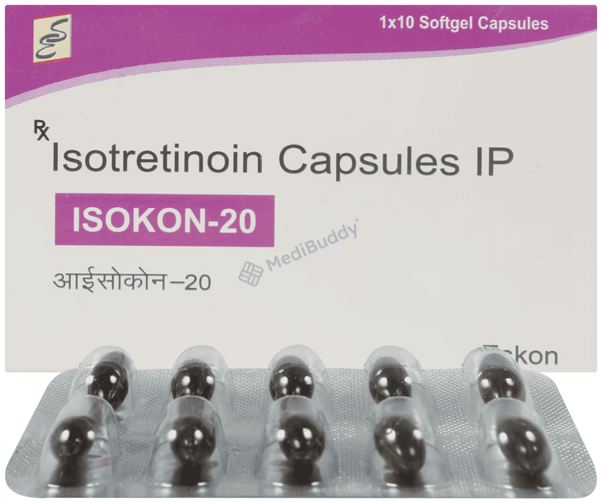 Isokon 20mg Capsule is used to treat nodular acne. This type of acne is severe and results from excess oil production in the skin cells. It causes swollen, red, and tender lumps in the skin, which can be large in size. Nodular acne affects the deeper layers of the skin and can lead to permanent scarring if not treated. Symptoms include painful blemishes that feel like hard knots under the skin. This medication helps by reducing oil production and preventing the growth of acne-causing bacteria.