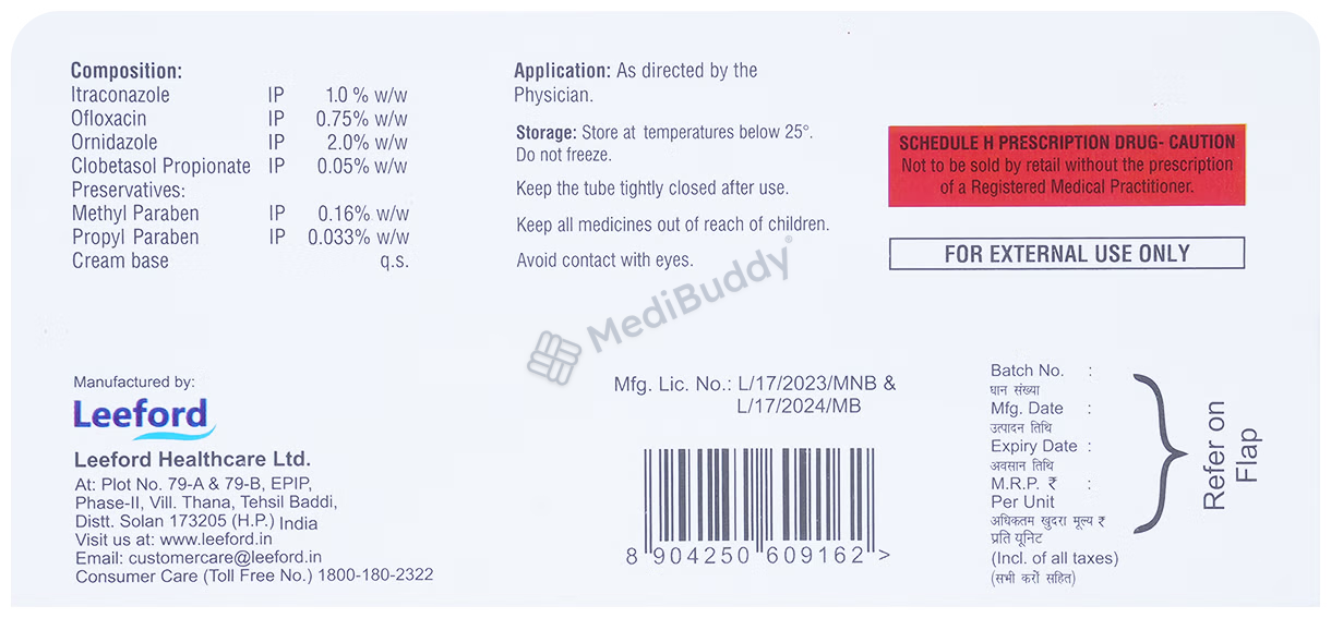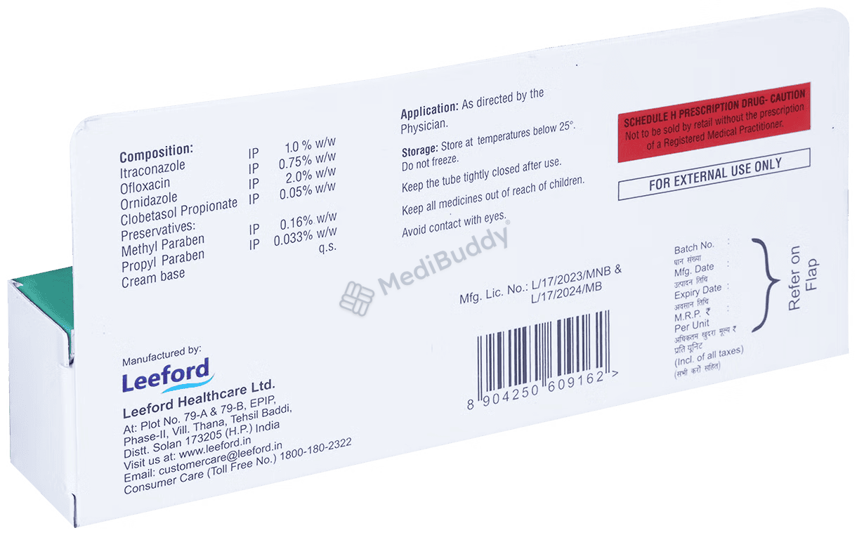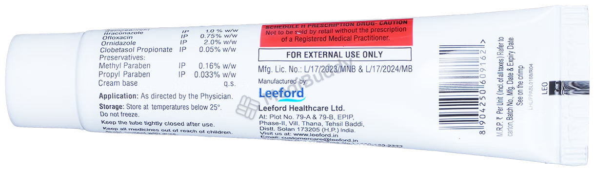 Ofloxacin(0.75% w/w) + Ornidazole(2% w/w) + Itraconazole(1% w/w) + Clobetasol(0.05% w/w)