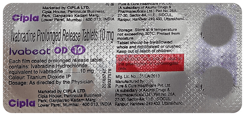 IVABEAT OD 10 TABLET contains the active ingredient Ivabradine, which belongs to a group of medicines known as Hyperpolarization-activated cyclic nucleotide-gated channel blockers. It is specifically indicated for the treatment of stable angina pectoris in adult patients who cannot tolerate or take traditional heart medicines, and for those with a heart rate equal to or above 70 beats per minute. It is also used in adult patients with chronic heart failure whose heart rate is equal to or higher than 75 beats per minute and can be used either in combination with beta blockers or when beta blockers cannot be used.