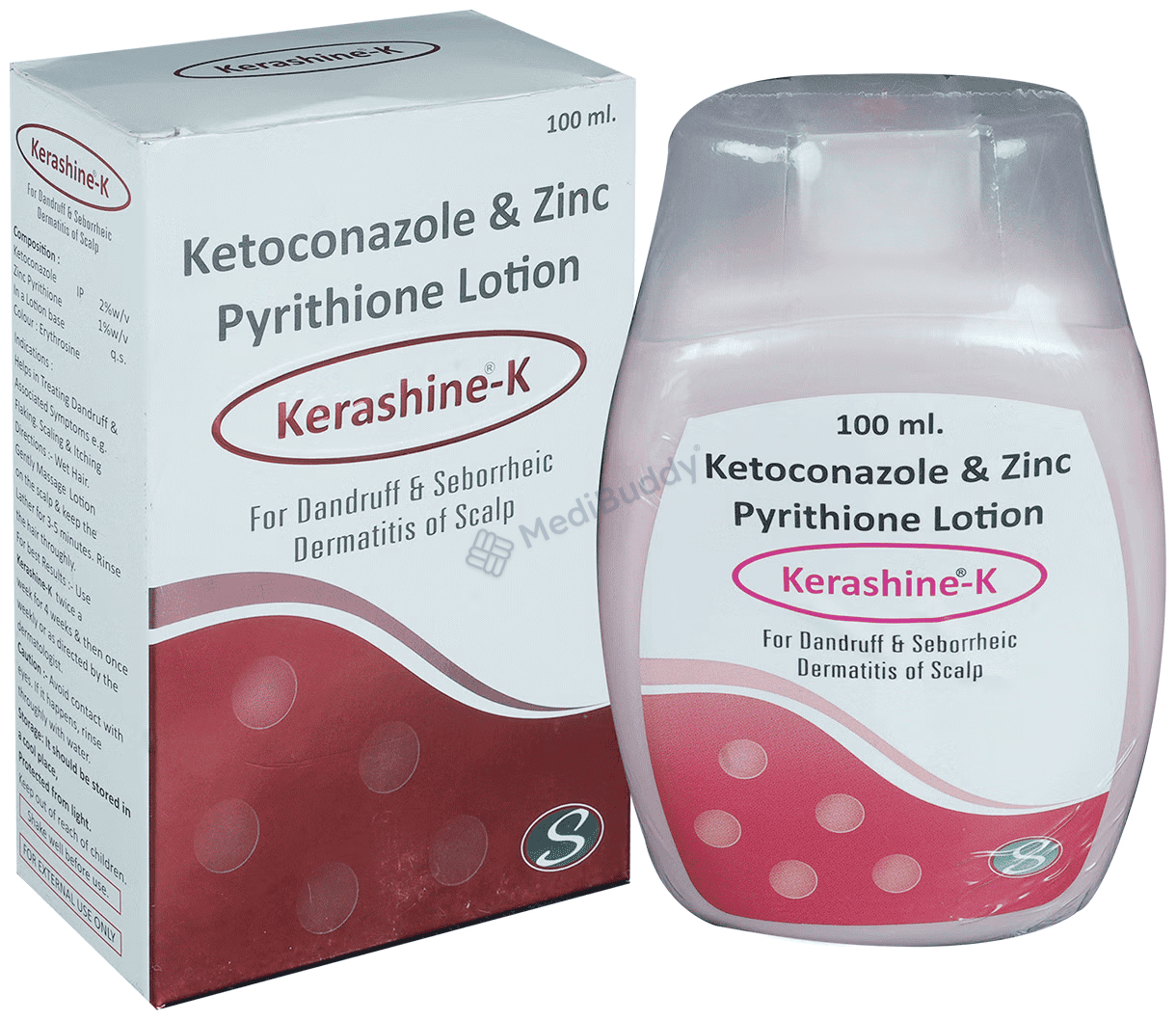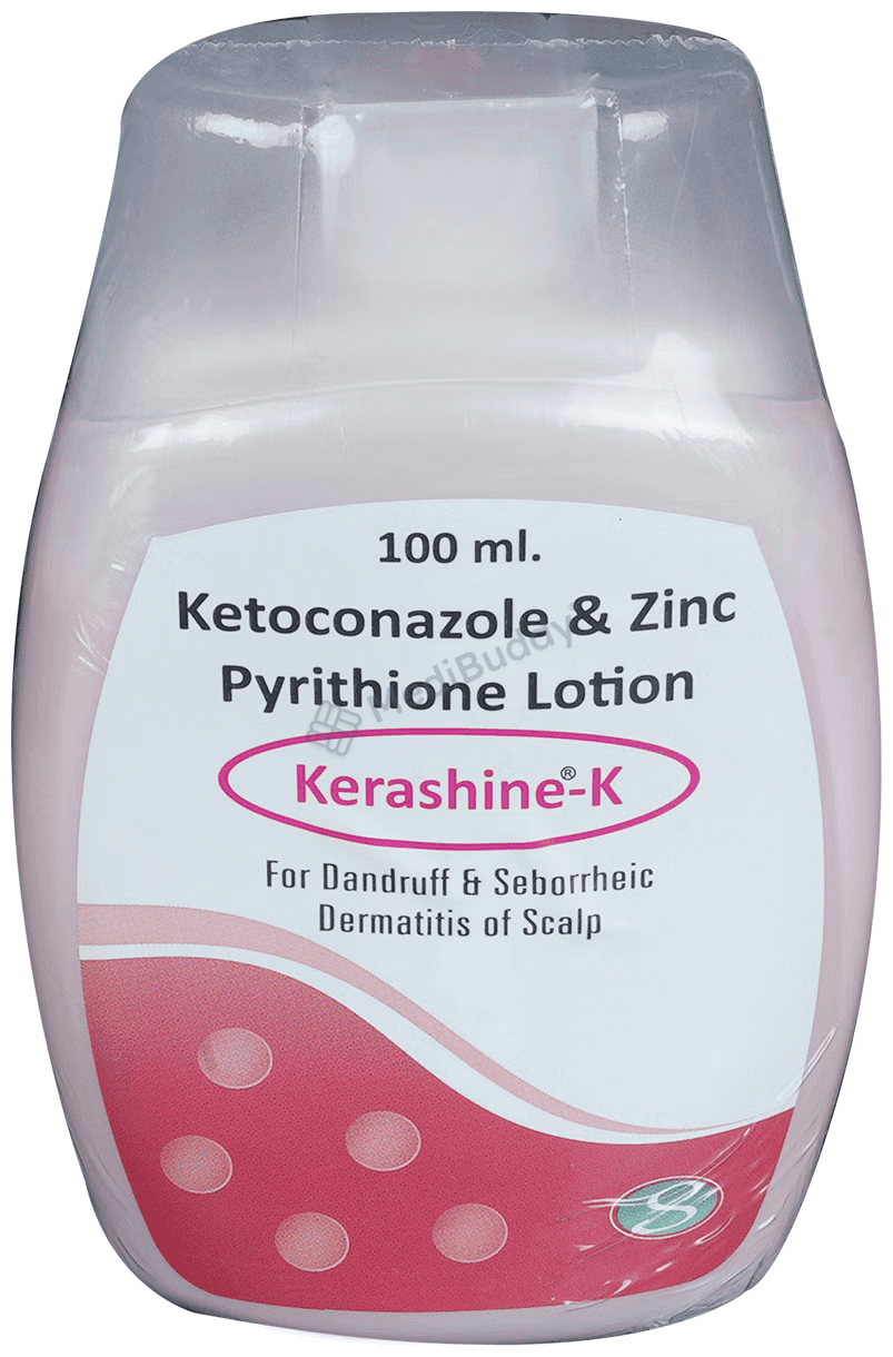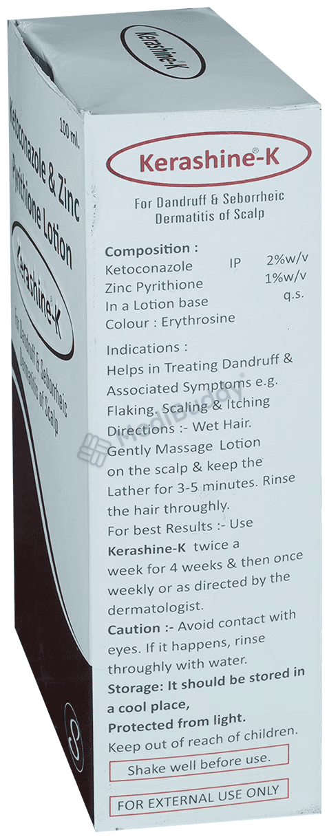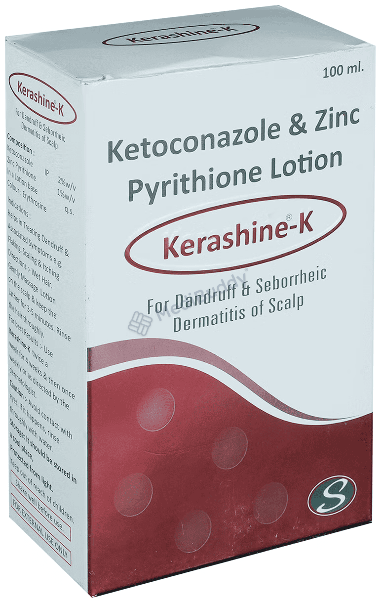 Kerashine-K Lotion contains Ketoconazole and Zinc pyrithione, which are classified as antimicrobials and are specifically used to treat and prevent dandruff and seborrheic dermatitis, a fungal infection that causes dry or oily scaling on the scalp and other body parts. Before starting to use Kerashine-K Lotion, it is important to inform your doctor about any allergies you may have or if you are currently using any steroids. Although this lotion is generally suitable for pregnant and breastfeeding women, it is still recommended to seek advice from your doctor before using it.