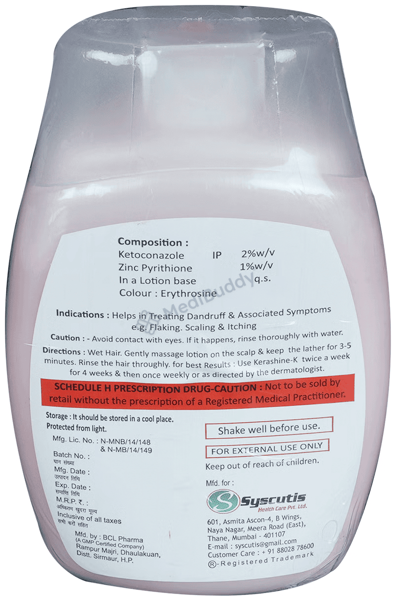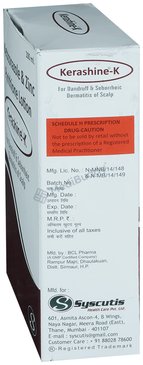 Kerashine-K Lotion is an effective treatment for fungal skin infections and dandruff. It helps in killing the fungi causing the infections and relieves itching and irritation. It is used in conditions like athlete’s foot, jock itch, ringworm, candidiasis, and dandruff. The medicine should be applied only to the affected skin areas with clean hands. It may take several days to weeks for symptoms to improve, so it's important to use it regularly as prescribed. Consult your doctor if you experience any side effects like burning, redness, or itching.