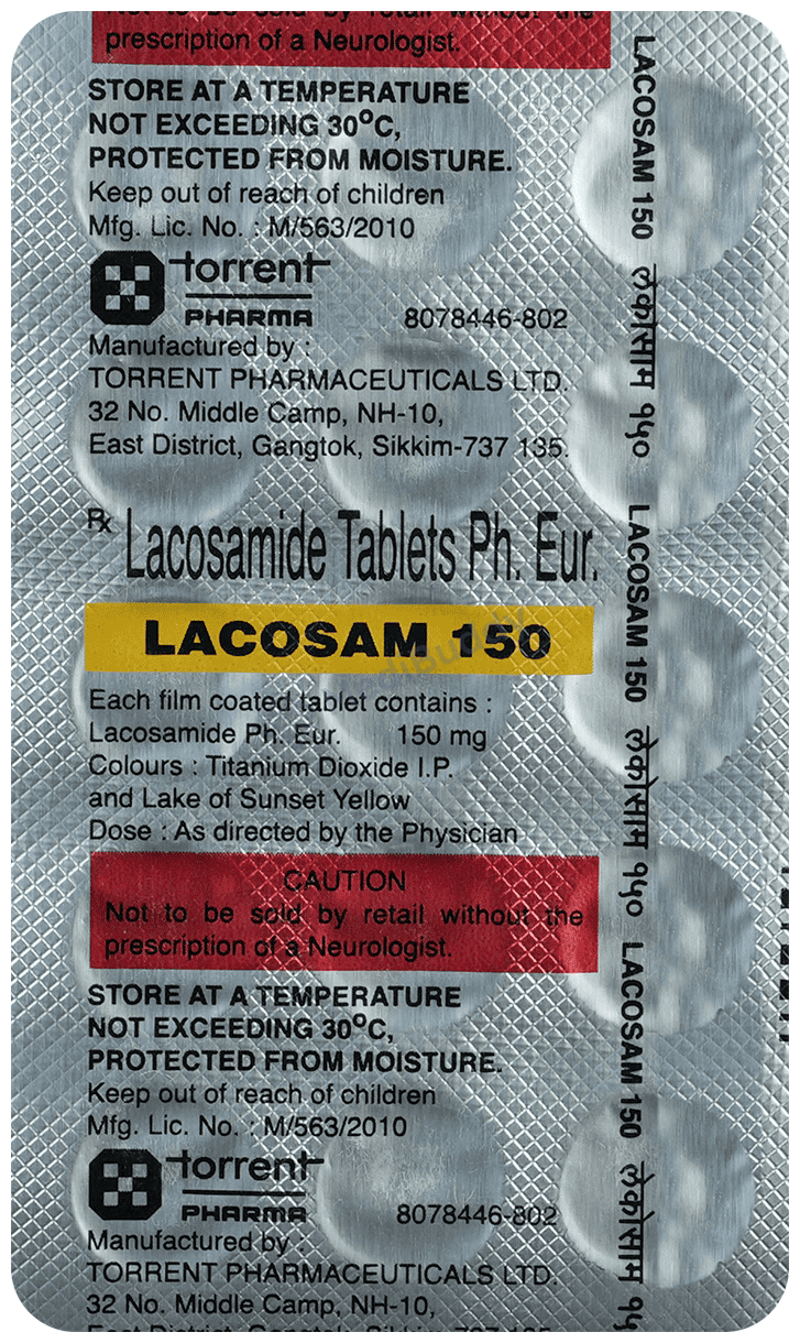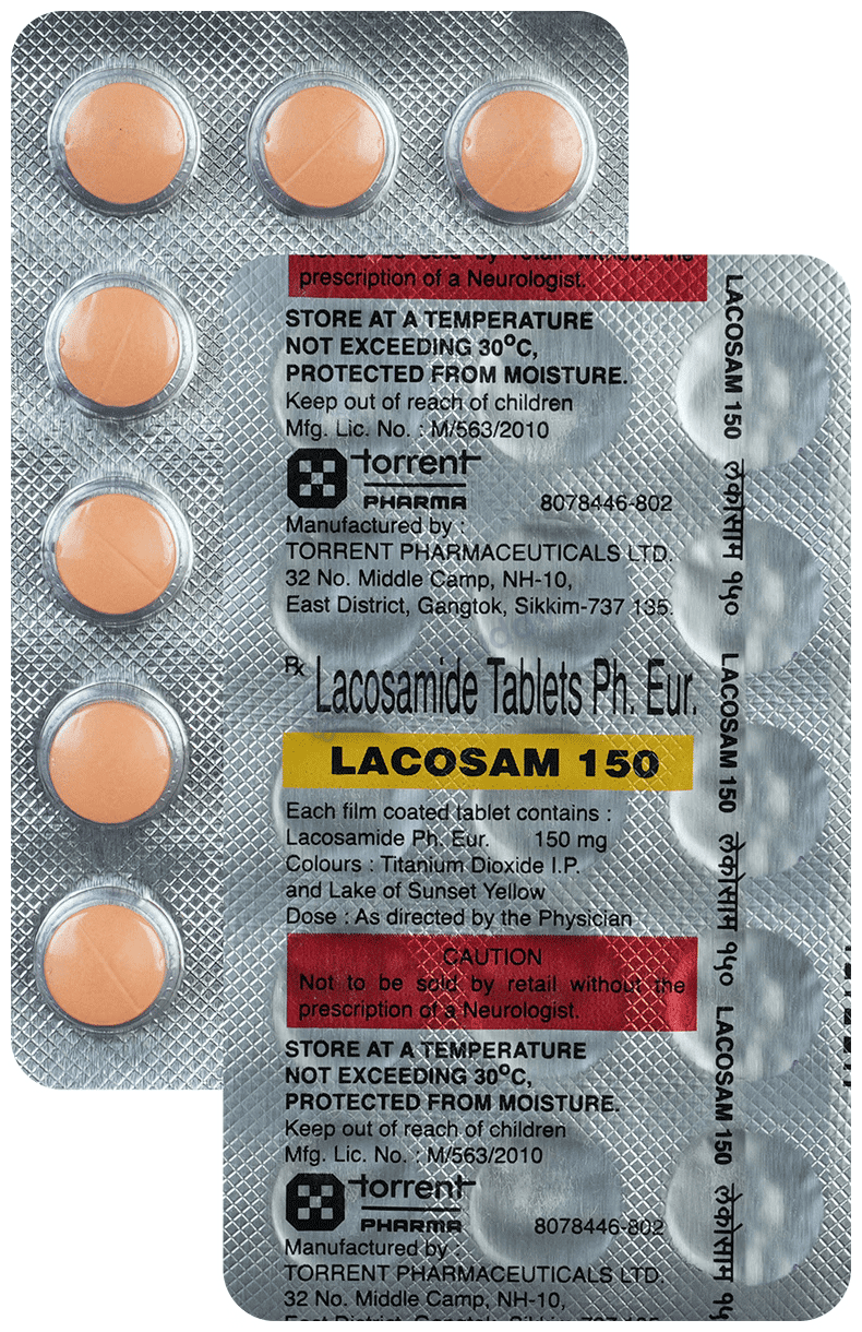 Lacosam 150 Tablet is used to manage and prevent epilepsy, also known as seizures. It works by reducing the abnormal activity of nerve cells in the brain that lead to seizures. It is important to take this medicine regularly, preferably at the same time each day. Missing a dose can be harmful, so it is advised to keep extra stock. Even if you start feeling better, complete the full course of treatment and consult your doctor before stopping the medication to avoid an increase in seizure frequency. This medicine can cause side effects like headaches, dizziness, dry mouth, muscle spasms, blurred vision, nausea, and double vision, but most of these side effects improve over time. Be mindful of weight changes while using this medication and maintain a healthy diet and regular exercise routine. If side effects persist or cause concern, consult your doctor.