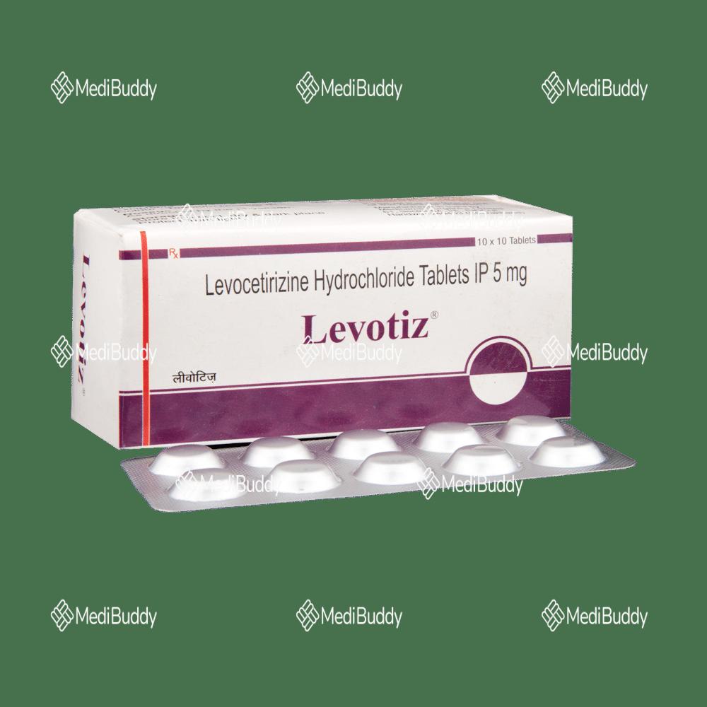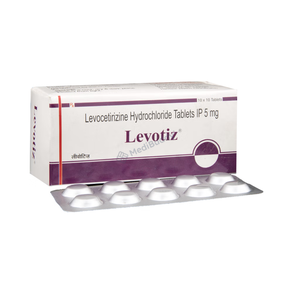 Levotiz Tablet is used to treat various allergic conditions such as hay fever, conjunctivitis, eczema, hives, and reactions to insect bites. It helps relieve symptoms like watery eyes, runny nose, sneezing, and itching. The medication can provide relief from blocked or runny nose, sneezing, and itchy or watery eyes, making it easier to carry out daily activities. It also helps with allergic reactions after insect bites and symptoms of hives and eczema, improving skin appearance and boosting mood and self-confidence. Levotiz Tablet may be taken as needed or regularly to prevent symptoms, and it is generally well-tolerated with mild side effects like sleepiness, dry mouth, and headache that typically resolve on their own.
