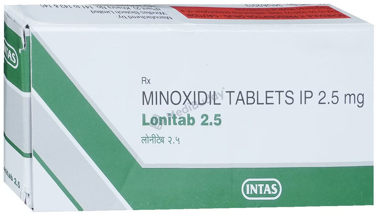 Lonitab 2.5 Tablet, containing Minoxidil as its active ingredient, acts as an antihypertensive vasodilator targeted at alleviating high blood pressure by dilating the blood vessels, enhancing blood flow, and subsequently reducing blood pressure levels. Individuals with a history of specific conditions such as pheochromocytoma, kidney diseases, pulmonary hypertension, congestive heart failure, angina, recent heart attack, asthma, migraine, and seizures should communicate these details to their healthcare provider before commencing treatment with Lonitab 2.5 Tablet.