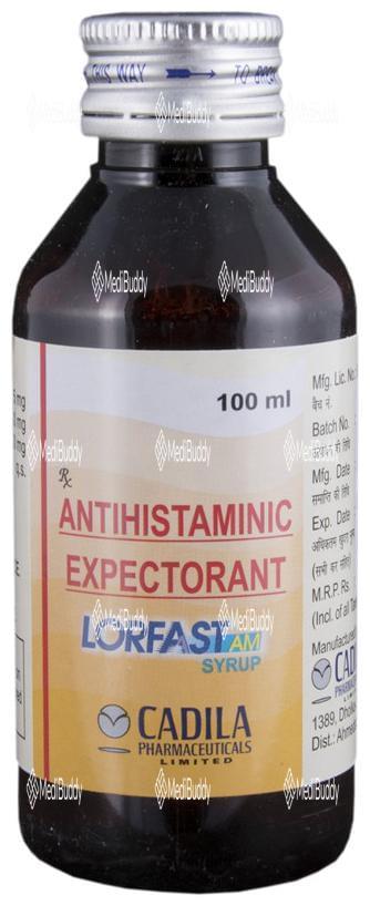 Lorfast-AM Syrup is specially designed to treat cough with mucus. By thinning and loosening mucus, this syrup helps you easily cough it out. It also relieves allergic symptoms, including sneezing, running nose, watery eyes, itching, swelling, and congestion or stiffness. When taken as directed by your doctor, Lorfast-AM Syrup can make breathing easier by reducing the frequency of coughing. It starts working quickly and its effects can last for several hours, allowing you to go about your daily activities more comfortably. Along with the medication, it's recommended to drink plenty of fluids and gargle with warm salt water for added relief.