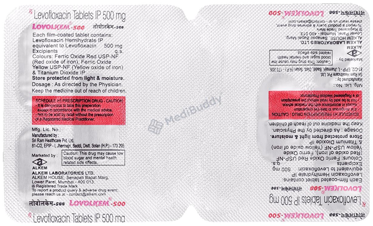 Lovolkem 500 Tablet is an antibiotic medication used to treat various bacterial infections. It effectively targets infections in the ear, nose, throat, lungs, urinary tract, skin, and soft tissues by killing and preventing the growth of the bacteria responsible for the infection. It is crucial to complete the full course of treatment as prescribed, even if symptoms improve, to ensure all bacteria are eradicated and to prevent antibiotic resistance. Common side effects may include headache, dizziness, nausea, constipation, and diarrhea, which usually resolve on their own but should be reported to your doctor if persistent. Make sure to follow your doctor's instructions and avoid the medication if allergic to any of its components. Special care is advised for individuals with kidney issues.