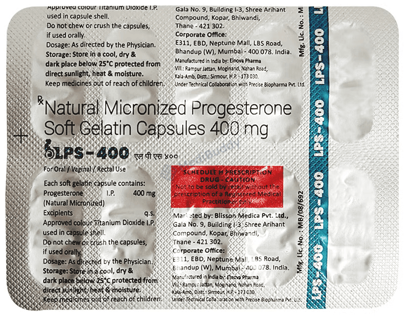 LPS 400 Soft Gelatin Capsule may also be prescribed during early pregnancy to support fetal growth, but consulting with your doctor is crucial before taking it. Not intended for use in breastfeeding women, children, or adolescents under 18 years of age, common side effects may include headache, hair loss, breast pain, stomach cramps, bloating, nausea, vomiting, irregular vaginal bleeding, fluid retention, and vaginal yeast infections. If any side effects worsen, seek medical advice promptly.