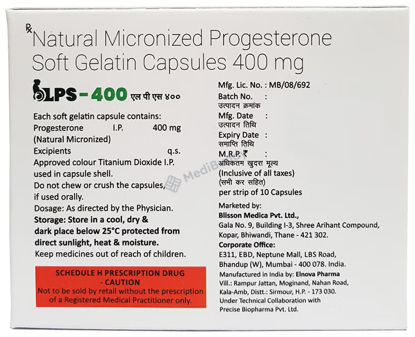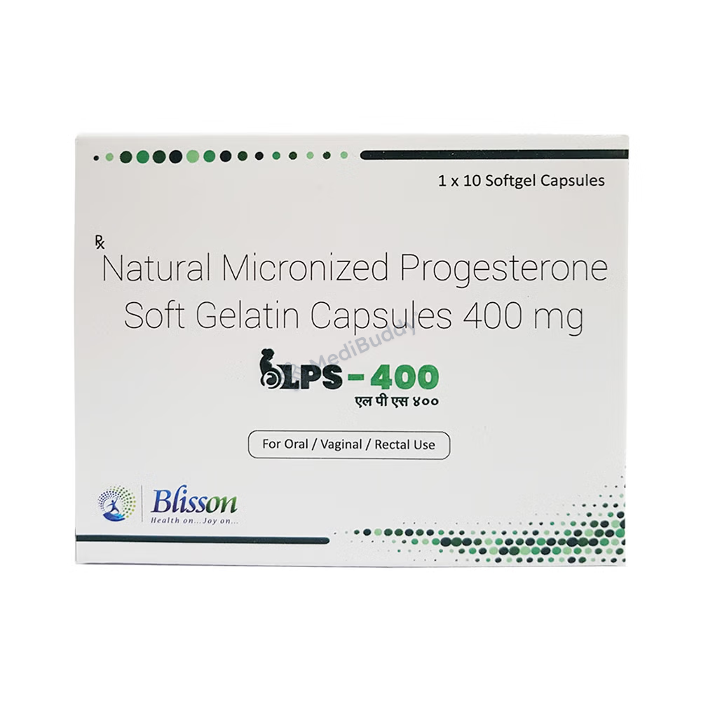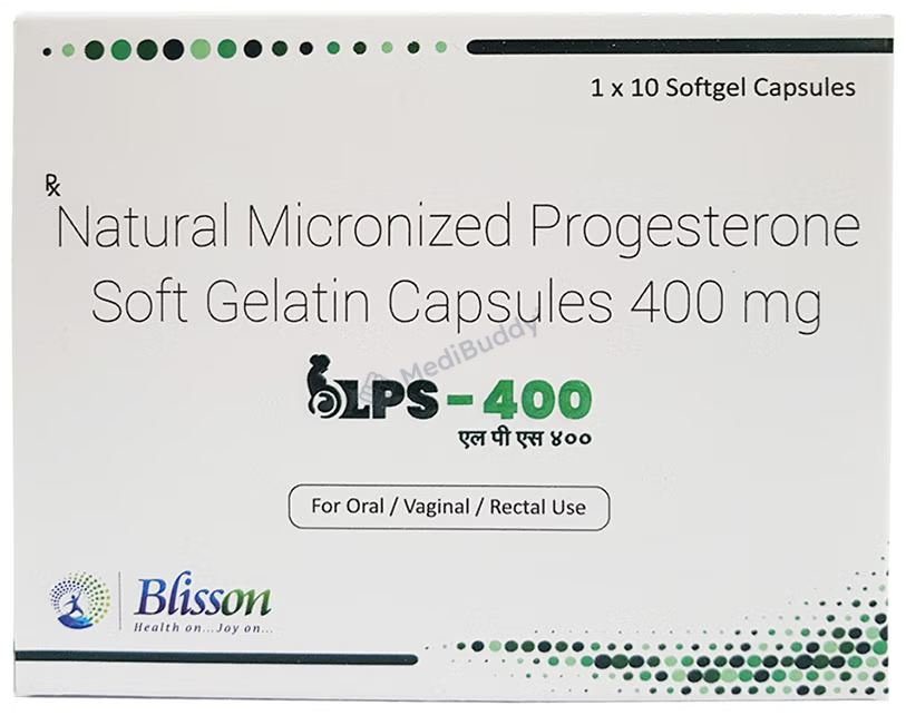 LPS 400 Soft Gelatin Capsule contains progesterone, a natural female sex hormone. It is used to treat menstrual and pregnancy-related issues caused by hormonal imbalance. It is also prescribed in hormonal replacement therapy to prevent endometrial hyperplasia. Common side effects may include headache, breast pain, vaginal bleeding, bloating, nausea, and hair loss, but they usually diminish over time. Consult your doctor if you experience persistent symptoms. Inform your doctor about any existing conditions, and avoid alcohol and smoking while taking the medication.