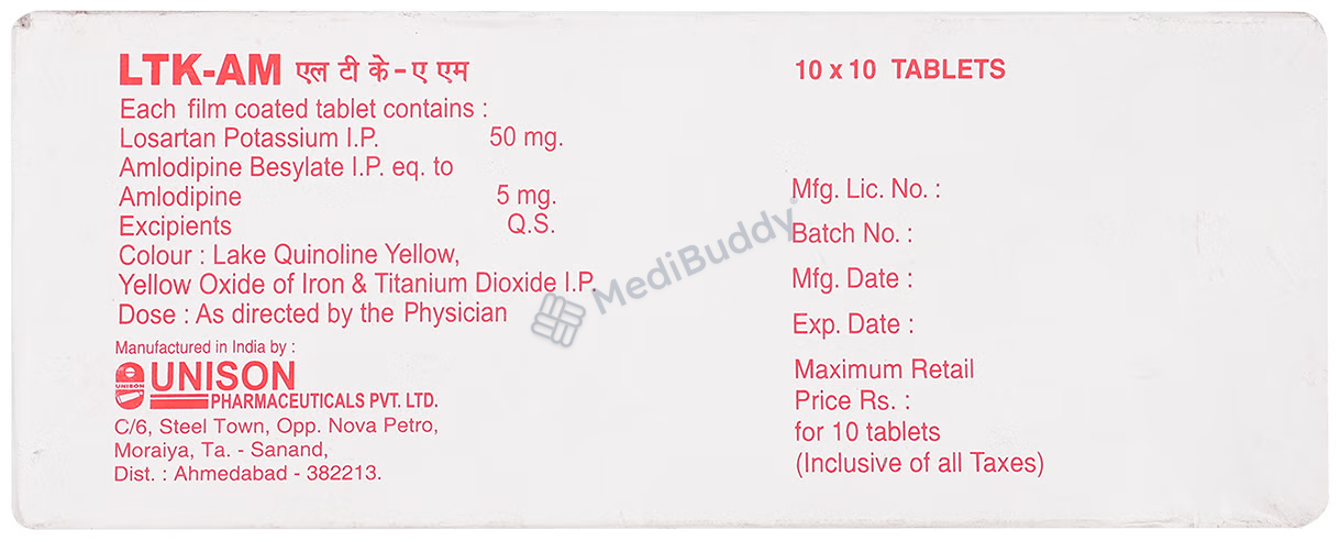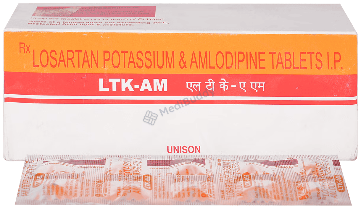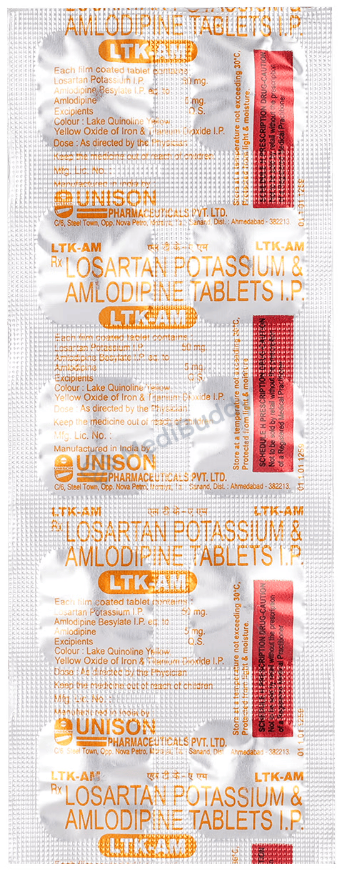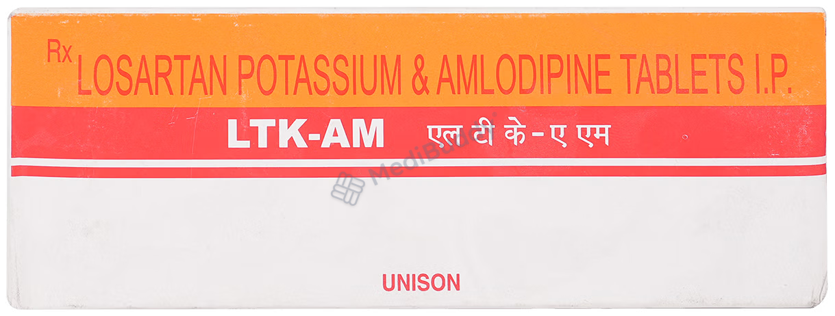 LTK-AM Tablet is a medication specifically designed to help control high blood pressure, also known as hypertension. This condition occurs when there is persistent elevation of blood pressure in the arteries, posing a risk factor for cardiovascular diseases. By widening and relaxing blood vessels, LTK-AM Tablet effectively lowers blood pressure. This tablet is a combination of two medicines, Losartan and Amlodipine. Losartan falls under the category of angiotensin II receptor antagonists, which work to prevent the narrowing of blood vessels, facilitate increased blood flow, and reduce blood pressure. Amlodipine, on the other hand, is a calcium channel blocker that dilates blood vessels and enhances blood flow. Together, these components contribute to lowering high blood pressure and addressing conditions related to coronary artery disease.