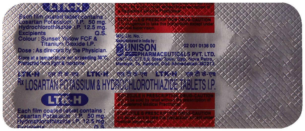 LTK-H Tablet is a medication used to treat high blood pressure, also known as hypertension. High blood pressure can increase the risk of serious health issues like heart attacks, strokes, and kidney failure if left untreated. The tablet is a combination of two medicines: Losartan, an angiotensin II receptor antagonist, and Hydrochlorothiazide, a diuretic (water pill). Losartan works by widening the blood vessels to improve blood flow, while Hydrochlorothiazide helps the body excrete excess salt to lower blood pressure.