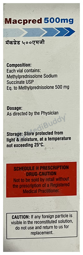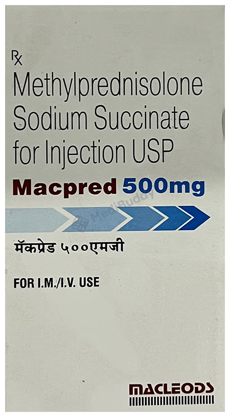 Macpred 500mg Injection contains Methylprednisolone, a type of corticosteroid medication used to treat various medical conditions. It is administered through injection by a healthcare professional into a vein, joint, or muscle. The dosage depends on the specific condition being treated and the severity of symptoms. It is essential to follow the prescribed amount and schedule exactly as directed to ensure optimal effectiveness and minimize the risk of side effects.