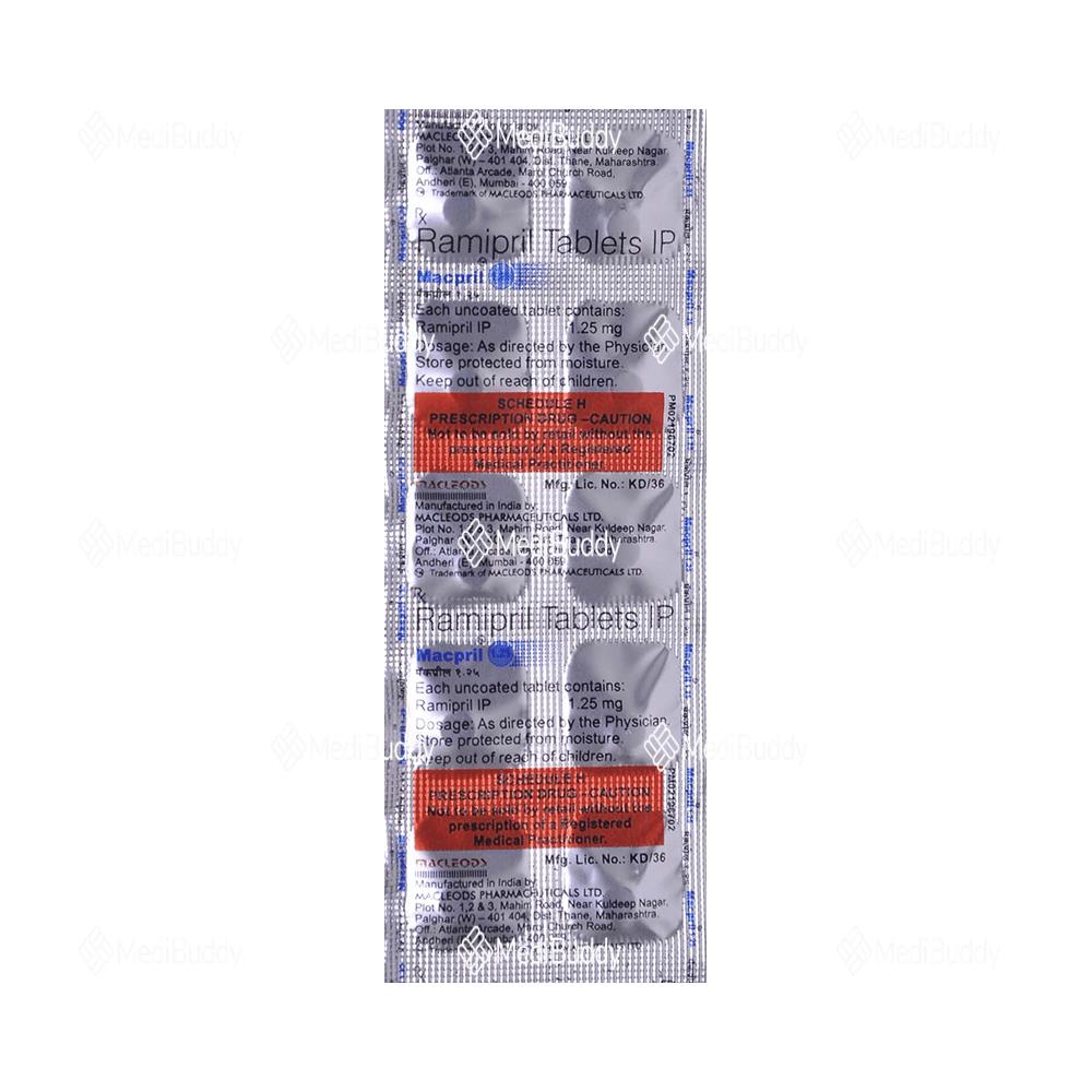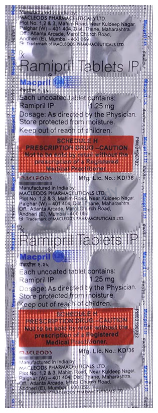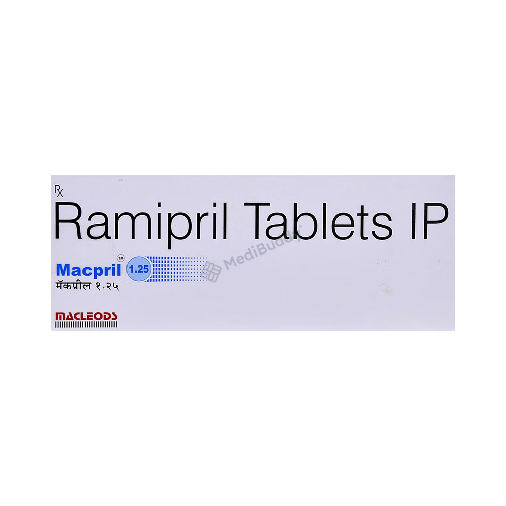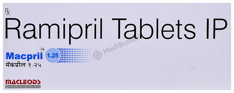 MACPRIL 1.25MG TABLET is a medication categorized under 'Angiotensin-Converting Enzyme (ACE) Inhibitors' primarily utilized for managing conditions like high blood pressure (hypertension) and minimizing the risk of cardiovascular events such as heart attacks, strokes, and heart failure. High blood pressure, also known as hypertension, is a lasting condition that causes elevated pressure in the blood vessels. MACPRIL 1.25MG TABLET contains 'Ramipril,' which functions by relaxing and dilating the blood vessels, making it easier for the heart to circulate blood throughout the body. This action contributes to reducing elevated blood pressure and lowering the probability of experiencing heart-related issues.