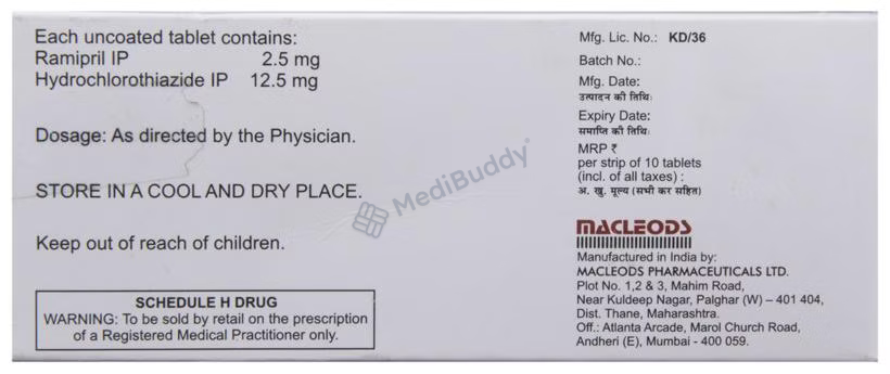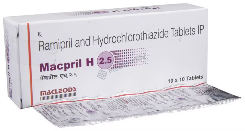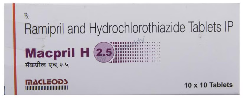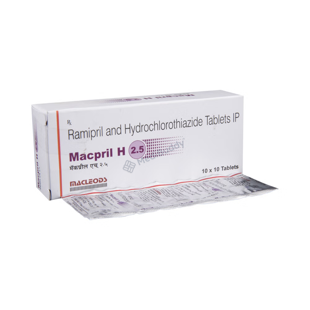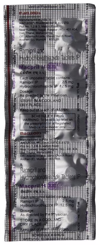 Macpril H 2.5 Tablet 10's, classified as an 'Angiotensin-Converting Enzyme (ACE) Inhibitor,' is specifically designed for managing hypertension and reducing the risk of cardiovascular events like heart attacks and strokes. It contains 'Ramipril,' which works by relaxing and widening blood vessels, making it easier for the heart to pump blood throughout the body, thereby lowering blood pressure. It is crucial to take Macpril 2.5 Tablet 10's at the same time each day, without chewing, crushing, or breaking it, and to swallow it whole with water for optimal effectiveness.