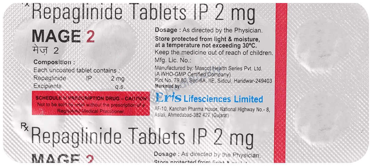 Mage 2mg Tablet contains Repaglinide, a meglitinide that works by increasing insulin production in the pancreas, thereby helping to regulate blood sugar levels especially after meals. It is crucial to follow your doctor's recommended dosage and not to discontinue the medication abruptly, even if you start feeling better. Abruptly stopping Mage 2mg Tablet can lead to fluctuations in blood sugar levels, increasing the risk of complications like retinopathy, nephropathy, and neuropathy. Regular monitoring through tests like kidney function and blood glucose levels may be recommended to ensure the medication is working effectively.