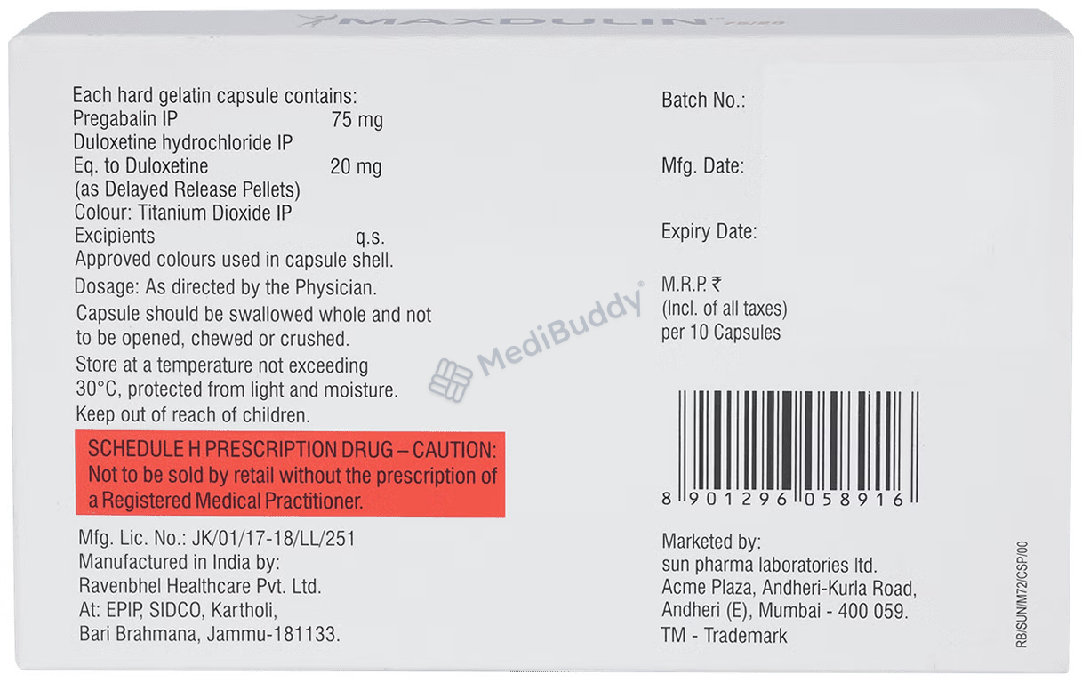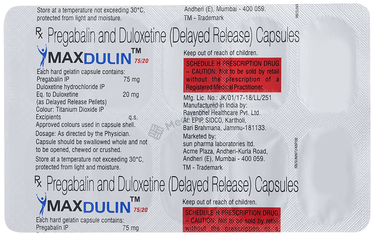 In summary, Maxdulin 75/20 Capsule DR is a medication used to alleviate neuropathic pain by affecting nerve cell activity and brain chemical levels. Adherence to prescribed dosages, awareness of potential side effects, and communication with your healthcare provider are essential for safe and effective use of this medication.