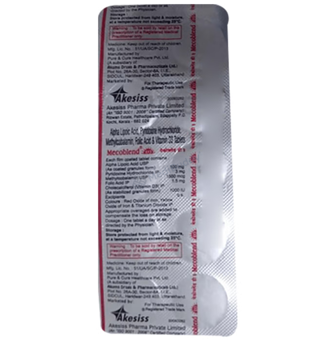 The key ingredients of Mecoblend D3 Tablet include Alpha lipoic acid, Folic acid, Methylcobalamin, Pyridoxine hydrochloride, and Vitamin D3. These ingredients work synergistically to combat various nutritional deficiencies by nourishing the body with essential nutrients. Specifically, Methylcobalamin and Pyridoxine hydrochloride aid in revitalizing and safeguarding damaged nerve cells by producing myelin, a protective substance. Alpha-lipoic acid acts as an antioxidant, managing oxidative stress to protect nerve tissues and the brain. Vitamin D3 contributes to enhancing calcium absorption in the blood, improving bone health, managing neuropathic symptoms, and enhancing balance. Pyridoxine hydrochloride plays a crucial role in the metabolism of carbohydrates, fats, and proteins, while Folic acid provides essential nutrients and promotes the production of red blood cells. Moreover, Methylcobalamin regulates key bodily functions such as cell multiplication, blood formation, and protein synthesis.