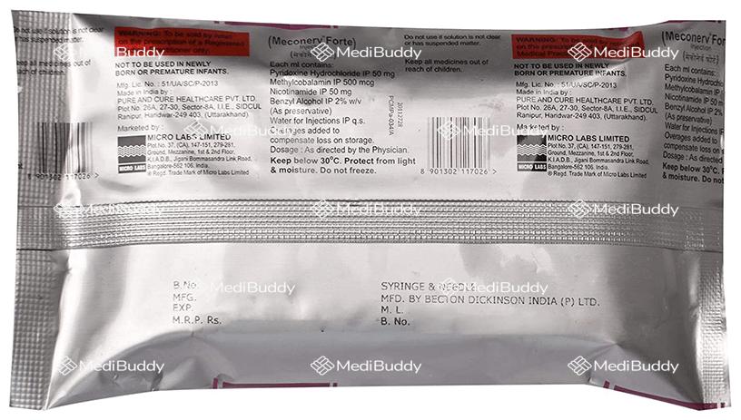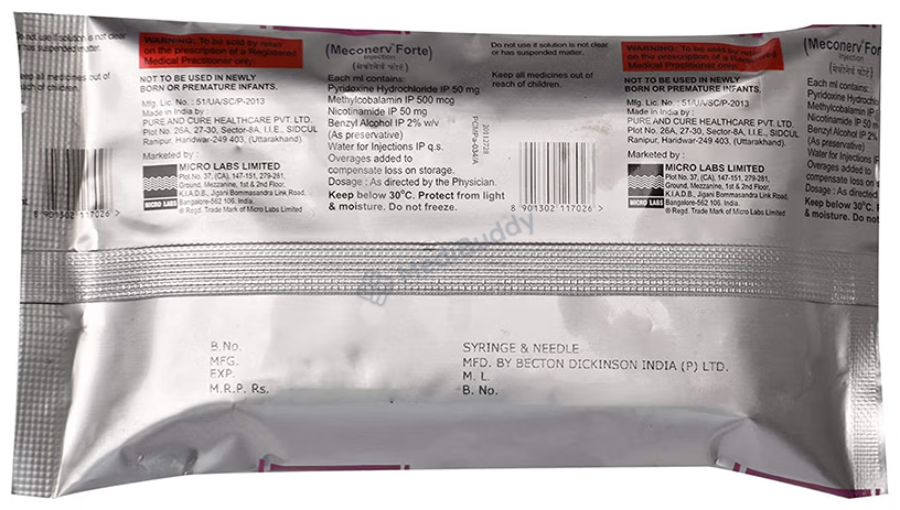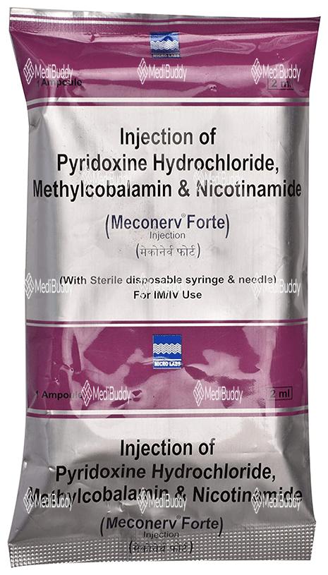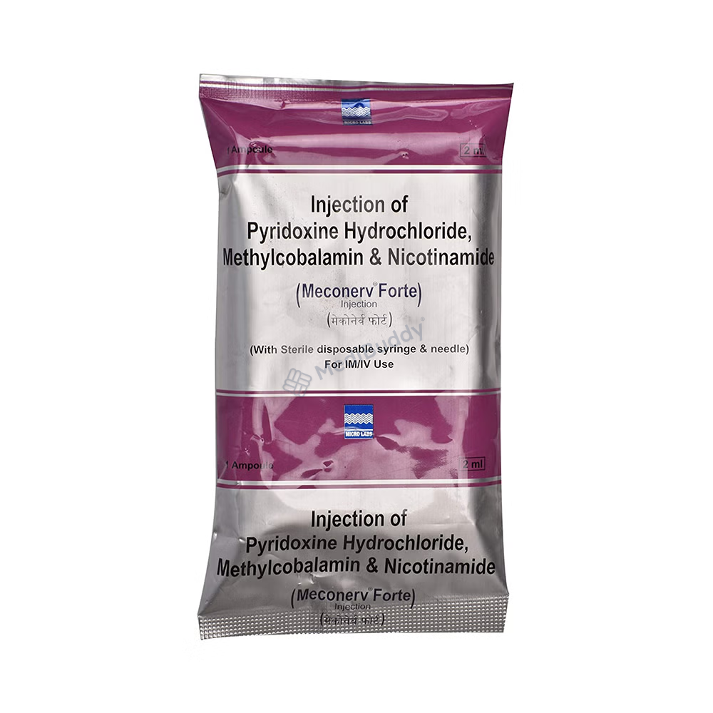 Meconerv Forte Injection is used to treat vitamin and nutritional deficiencies. It supports the body in its growth and functions. Always have a healthcare professional administer this injection, and inform them of any known allergies you may have. If you experience any injection site reactions like redness, swelling, or pain, consult your doctor. Inform your healthcare provider about any existing diseases or medications you are taking before starting Meconerv Forte Injection.