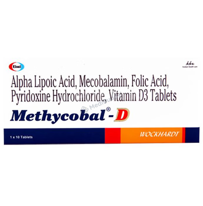 Methycobal D Tablet is a natural form of vitamin B12 that helps regulate essential bodily functions such as cell multiplication, blood formation, and protein synthesis. It is primarily used to manage vitamin B12 deficiency in individuals with pernicious anaemia. The key ingredients of Methycobal D Tablet include Alpha-lipoic acid USP, Folic acid I.P., Mecobalamin I.P., Pyridoxine Hydrochloride I.P., and Vitamin D3 I.P.