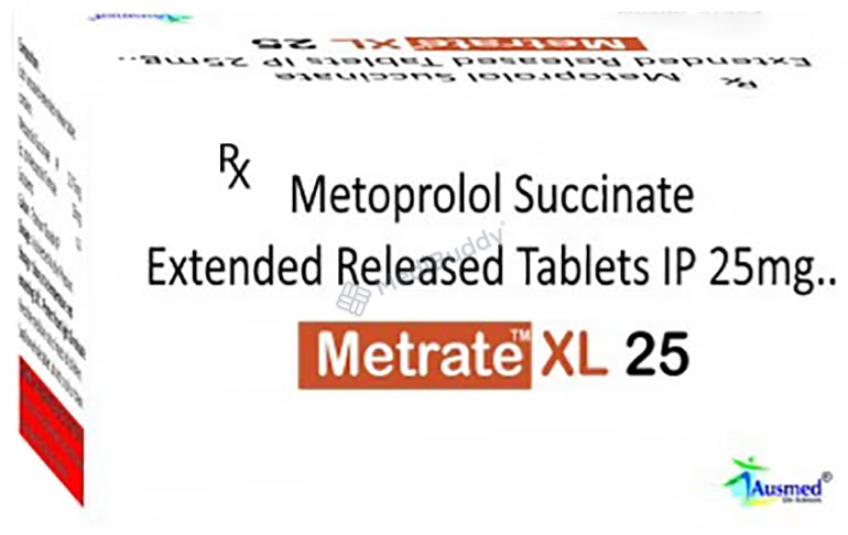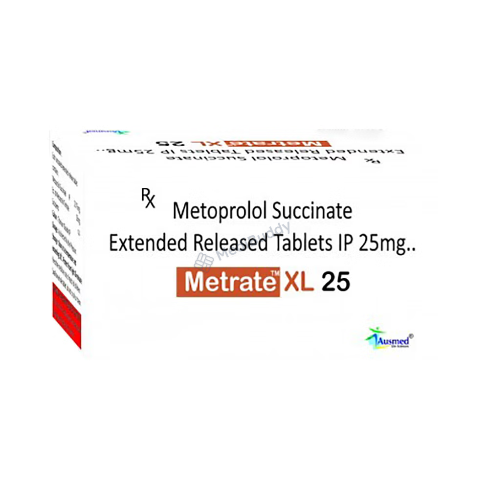 Metrate XL 25 Tablet belongs to a group of medicines known as beta-blockers. It is commonly used to manage conditions such as high blood pressure (hypertension), angina (chest pain related to the heart), and irregular heart rhythms (arrhythmia). Additionally, it is effective in preventing migraines, future heart attacks, and strokes.
