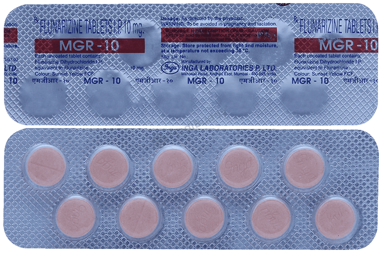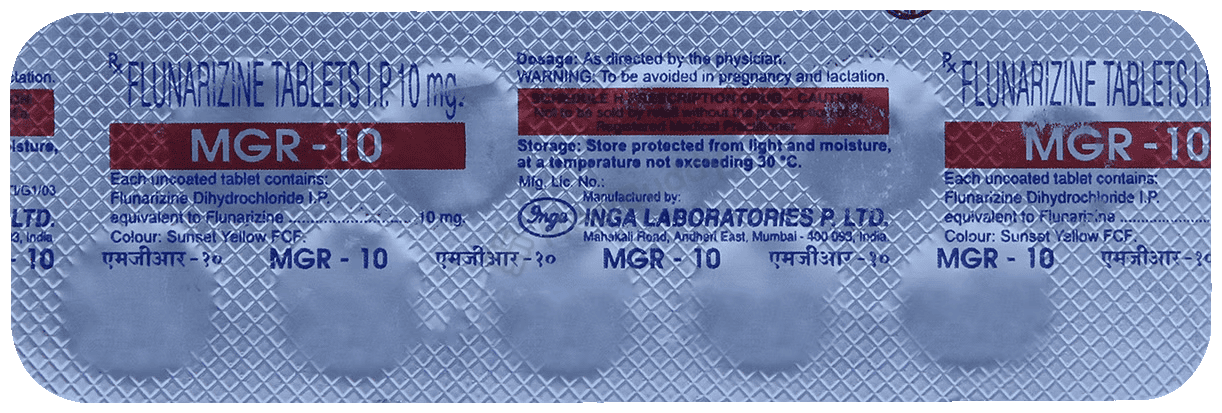 Mgr 10mg Tablet is composed of Flunarizine, classified as a Calcium Channel blocker. This formulation is aimed at mitigating the symptoms of migraines, a distinct form of headache characterized by intense pulsating pain, typically confined to one side of the head. Associated symptoms may include nausea, weakness, and heightened sensitivities to light and sound.