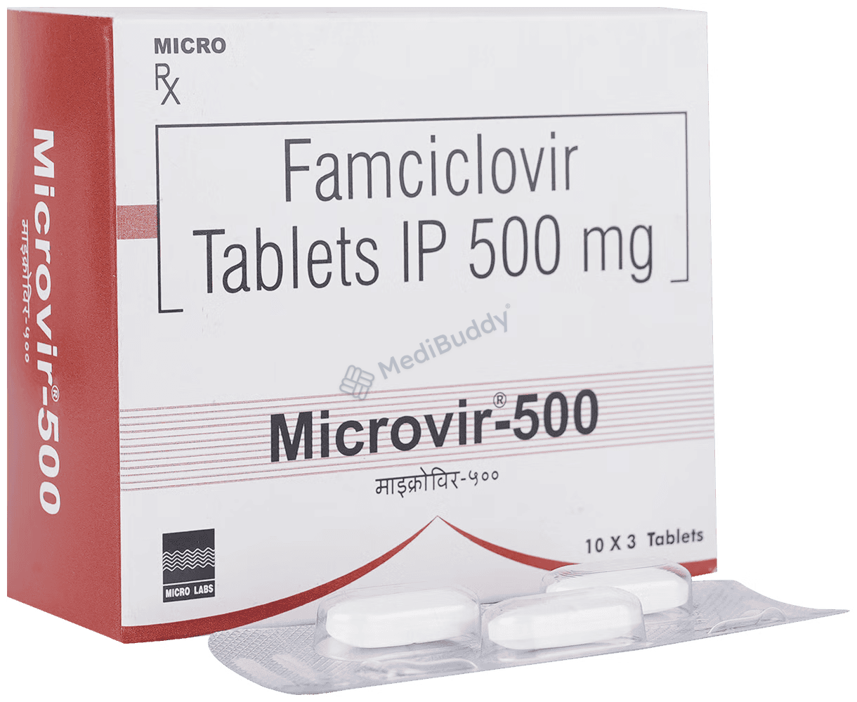 Microvir 500 Tablet is used to treat viral infections like herpes labialis, herpes simplex virus infections, shingles, and genital herpes infection. It works by stopping the virus from multiplying in the body, helping to clear the infection. For best results, follow your doctor's dosage instructions, drink lots of water, and finish the full course of treatment. Possible side effects include headache, dizziness, nausea, and fatigue. Contact your doctor if these side effects continue. Microvir 500 Tablet can speed up healing of cold sores, decrease symptoms of herpes infections, and shorten the duration of shingles.