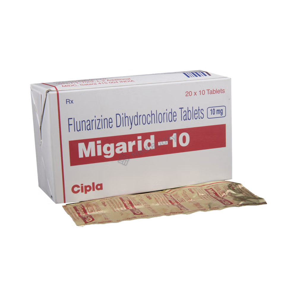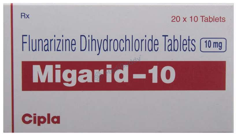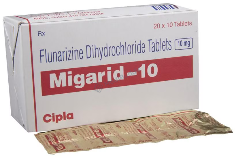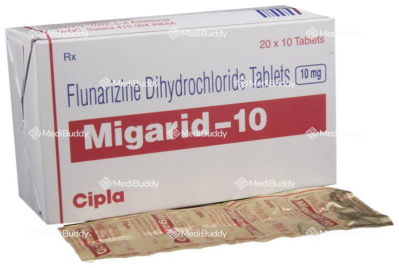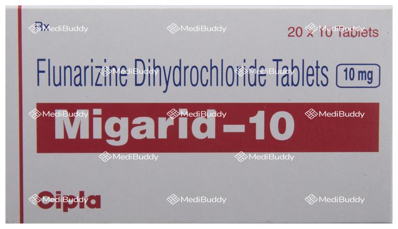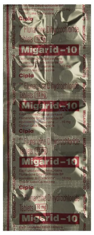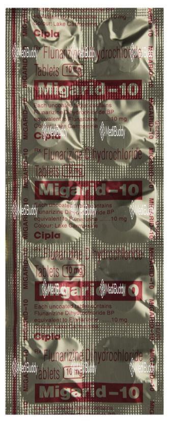 Migarid 10 Tablet is a medication designed to prevent migraines by relaxing the brain to ward off migraine headaches. It falls under the category of calcium channel blockers and contains Flunarizine, a key ingredient used to treat migraines, dizziness, and vertigo. As a preventive measure, Migarid 10 Tablet improves blood flow and dilates blood vessels in the brain to prevent vessel dilation, loss of tone, and migraine-induced headaches.