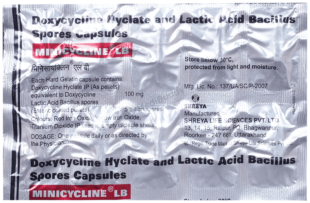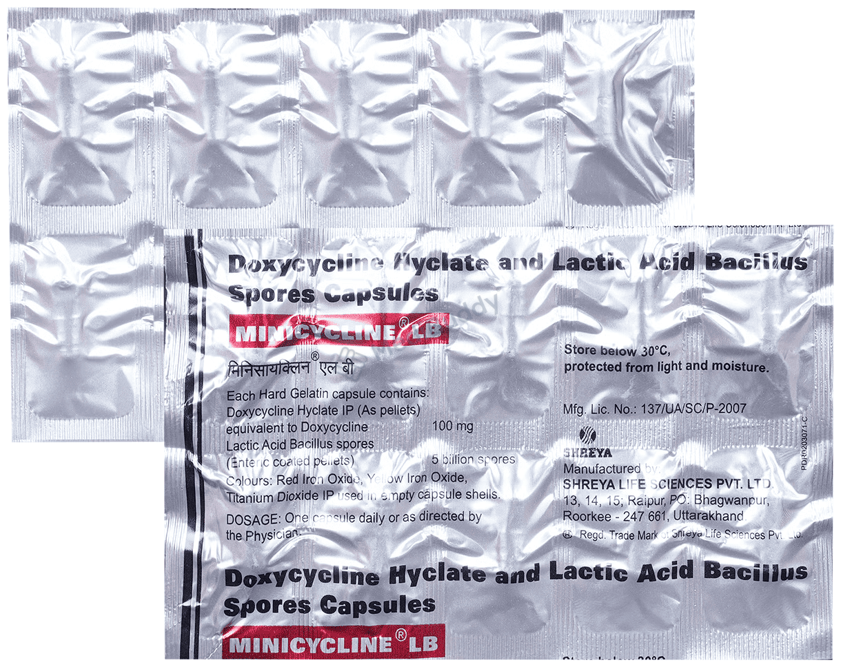 Minicycline LB Capsule is a combination medication used to treat various bacterial infections that can occur in different parts of the body, such as the urinary tract, intestines, respiratory system, eyes, gums, and even sexually transmitted infections like gonorrhoea and syphilis. These infections result from harmful bacteria multiplying inside or on the body. Minicycline LB Capsule works by preventing the growth of these bacteria, thus helping to eradicate the infection. It contains two key components, Doxycycline and Lactobacillus.
