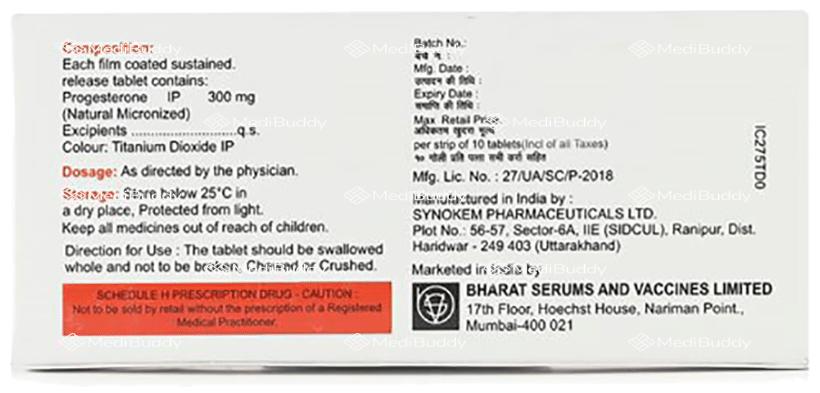 Miprogen 300mg Tablet SR contains progesterone, which belongs to the group of steroid hormones and is essential for addressing infertility due to progesterone deficiency. This medication can also support pregnancy by maintaining the uterine lining thickness, reducing the risk of threatened abortions and pre-term delivery by enhancing serum progesterone levels. It is used to manage conditions related to progesterone deficiency, such as abnormal uterine bleeding, secondary amenorrhea, and menopausal disorders in combination with estrogen therapy.