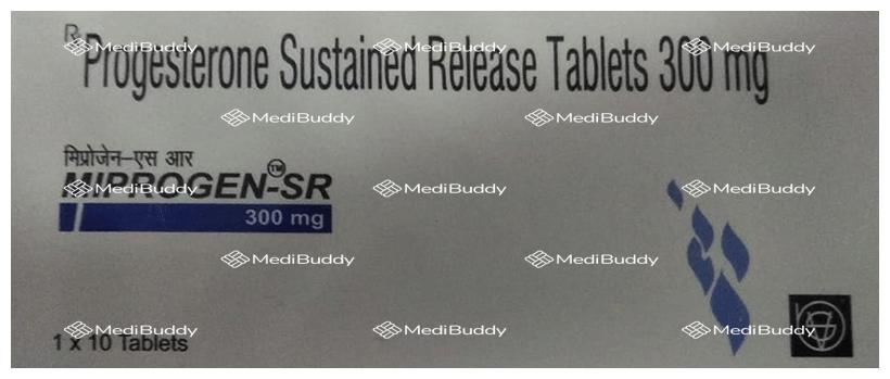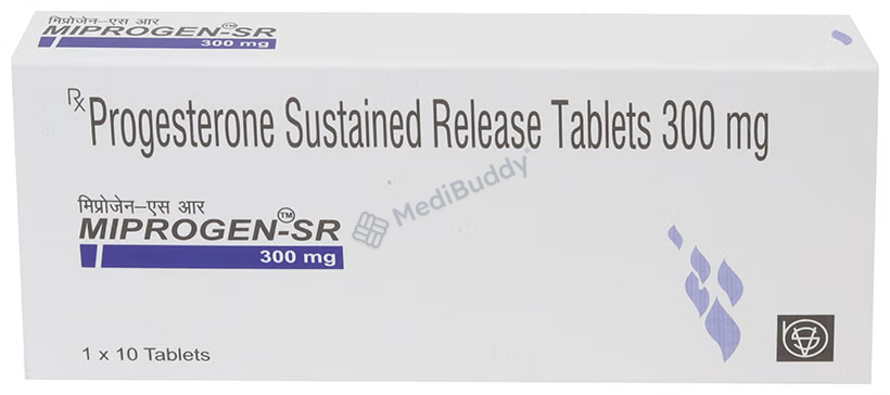 Miprogen 300mg Tablet SR, containing progesterone, is used to treat menstrual and pregnancy-related problems caused by hormonal imbalances. It is also used in hormonal replacement therapy with estrogen to prevent endometrial hyperplasia. Common side effects may include headache, breast pain, vaginal bleeding, stomach cramps, bloating, nausea, hair loss, edema, and yeast infections. Prior medical conditions like breast cancer, vaginal bleeding, or liver disease should be disclosed to the doctor before starting treatment. Initial side effects usually decrease with time. If symptoms persist, consult with your healthcare provider.