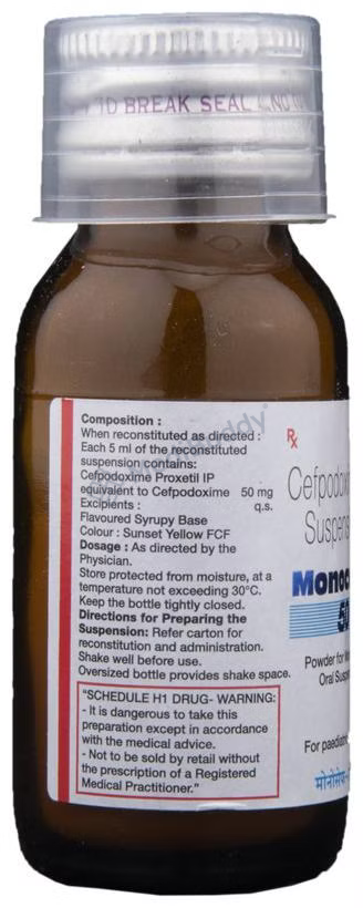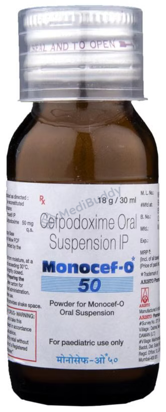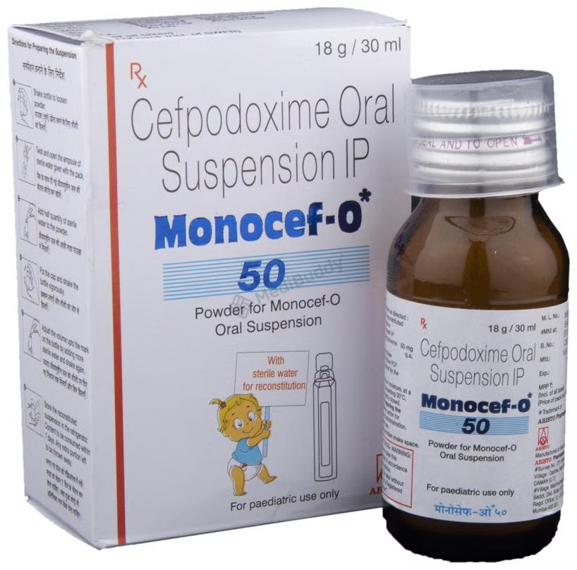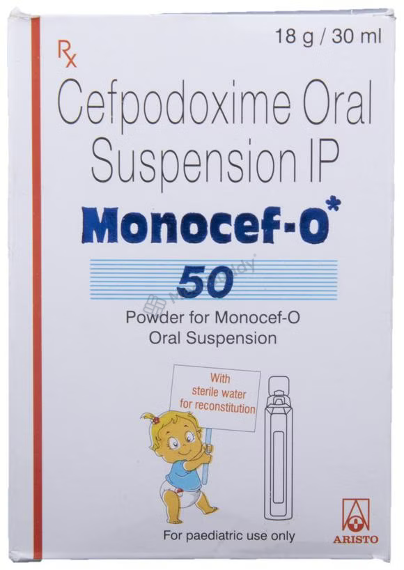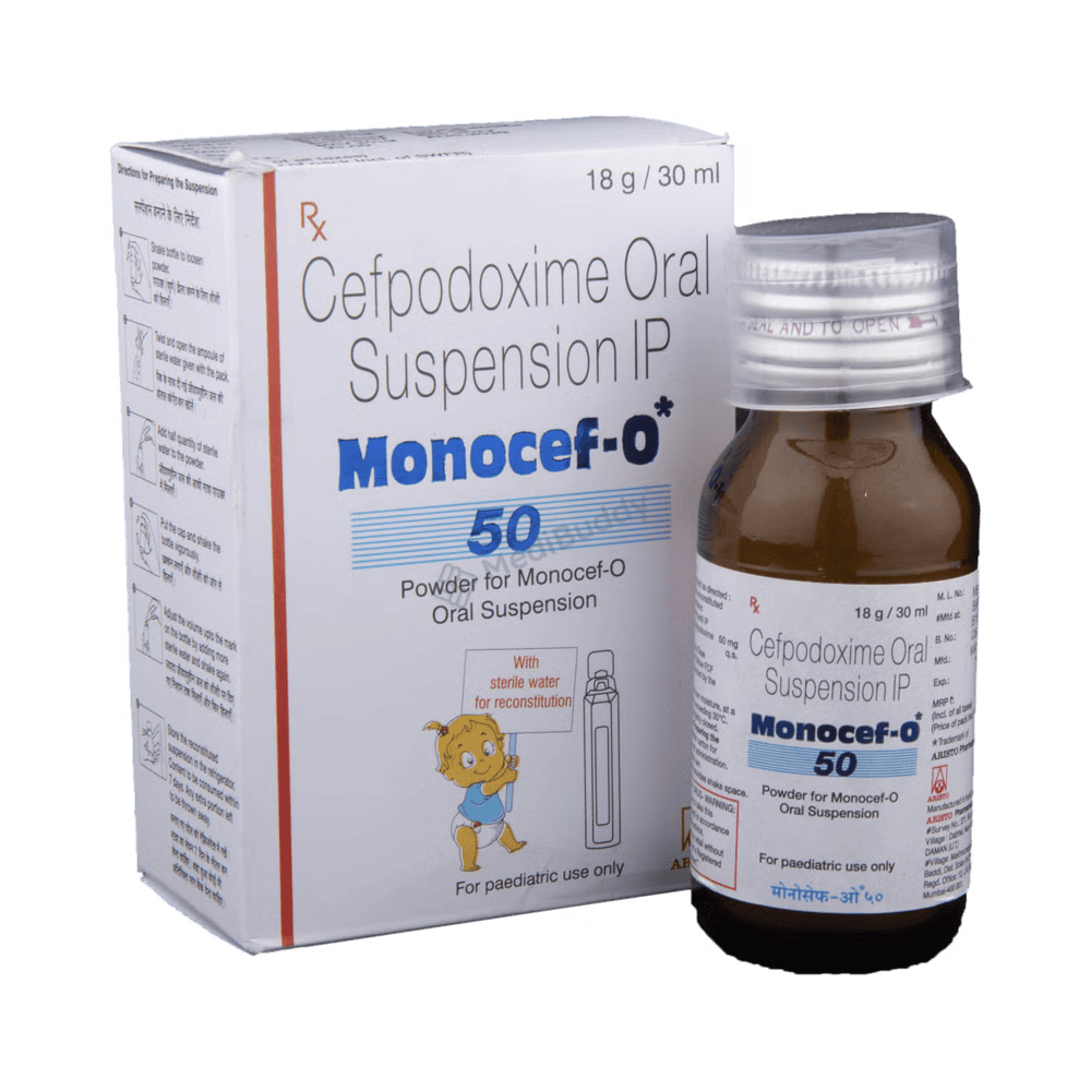 Monocef-O 50 Oral Suspension is an antibiotic medicine commonly prescribed for children to treat a variety of bacterial infections affecting different parts of the body such as the ears, eyes, nose, throat, lungs, skin, gastrointestinal tract, and urinary tract. It is also effective in managing typhoid fever in children and adolescents. Cefpodoxime, the active ingredient in Monocef-O 50 Oral Suspension, belongs to the cephalosporin group of antibiotics and works by preventing the formation of the bacterial cell wall, ultimately leading to the eradication of the harmful bacteria causing the infection.