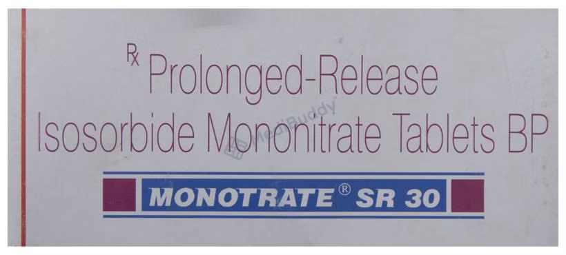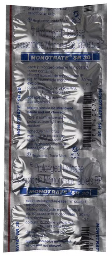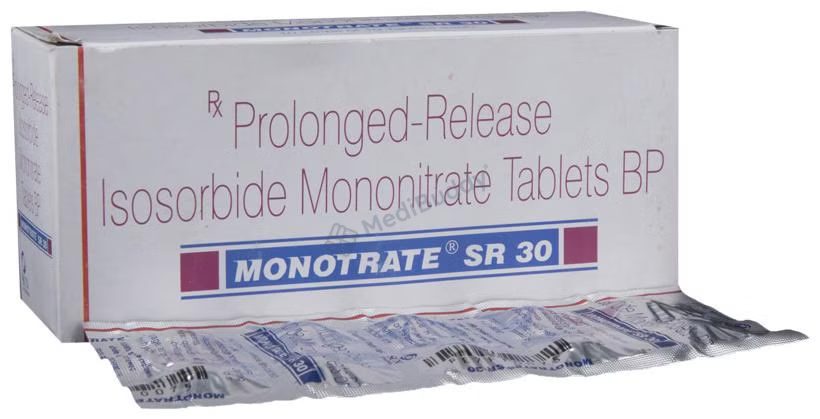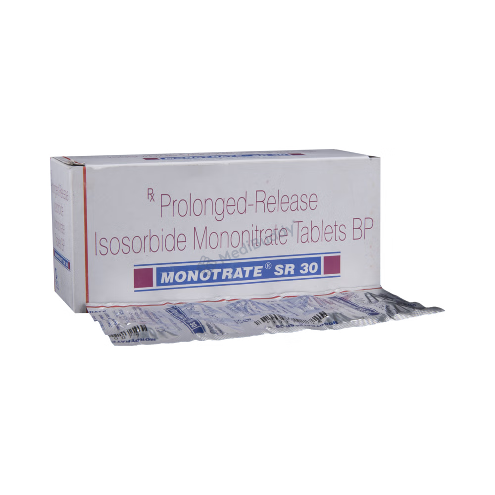 Monotrate SR 30 Tablet is a medication used to prevent heart-related chest pain, also known as angina. It works by relaxing and widening blood vessels, allowing blood to flow more easily to the heart. It does not treat ongoing angina attacks but helps prevent future episodes. It is important to take this medicine as prescribed by your doctor, even if you start feeling better, to avoid an increased risk of chest pain if the medication is stopped suddenly.