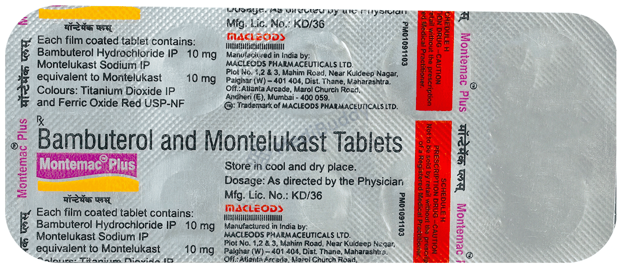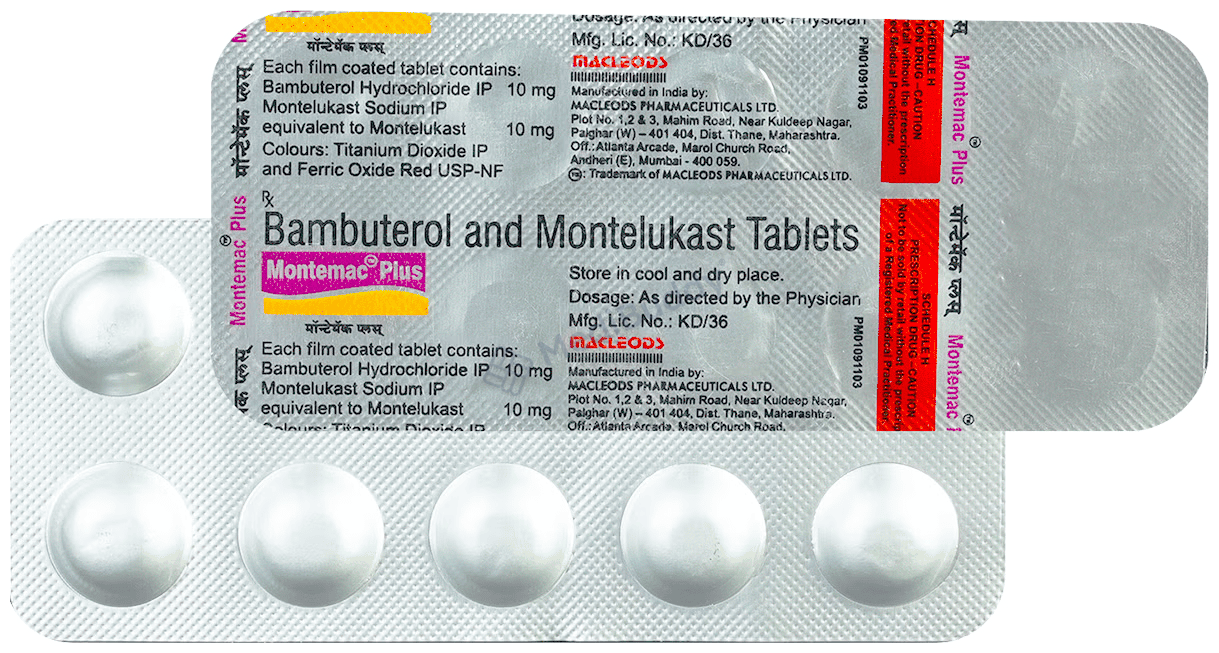 Montemac Plus Tablet 10's is a respiratory medication primarily used in the treatment of asthma, which is a condition where airways narrow, swell, and produce excess mucus, leading to breathing difficulties. This tablet is a combination of two medicines: Bambuterol, a bronchodilator, and Montelukast, a leukotriene receptor antagonist. Bambuterol works by relaxing muscles and widening the airways in the lungs, making it easier to breathe. It also helps in dissolving thick mucus and has anti-inflammatory properties. Montelukast, on the other hand, blocks inflammatory chemicals called leukotrienes, reducing swelling and inflammation in the lungs and preventing asthma attacks.