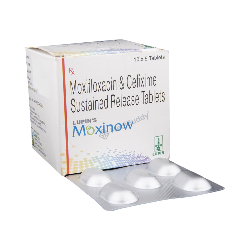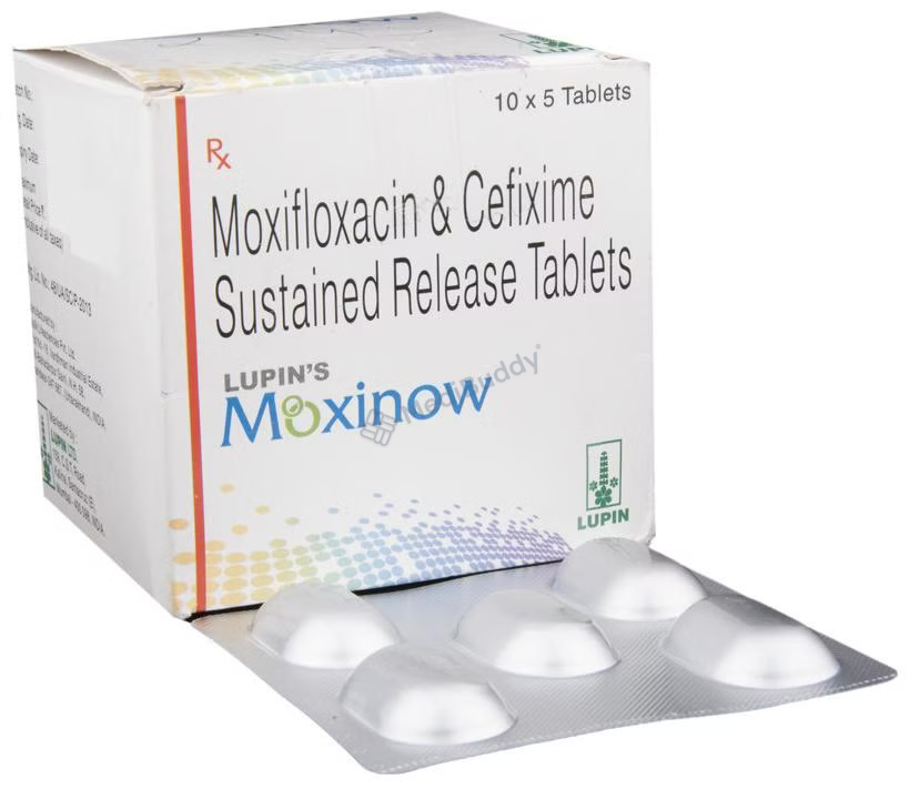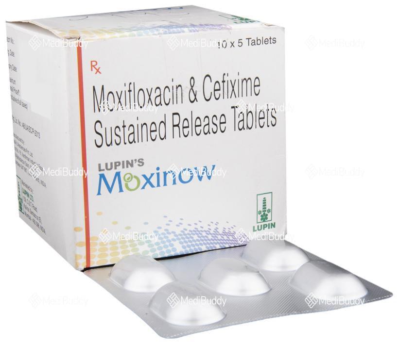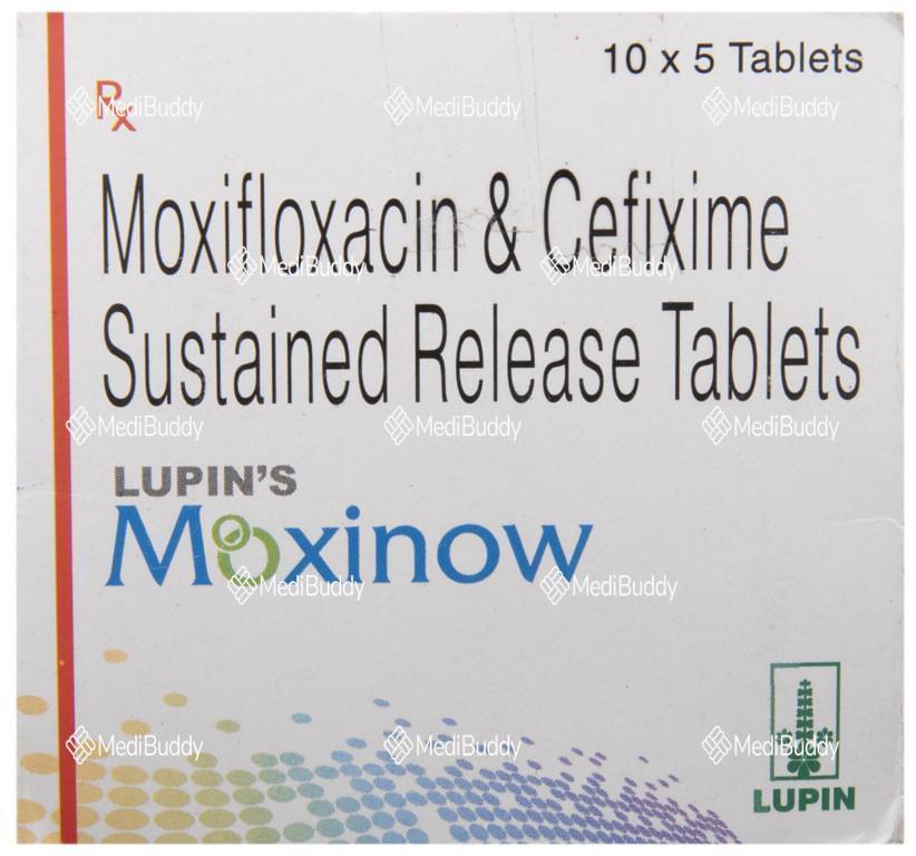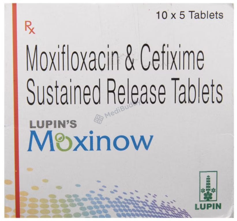Moxinow Tablet SR comprises Cefixime and Moxifloxacin, classified as antibacterial agents predominantly utilized in treating bacterial infections affecting areas such as the ears, lungs, and urinary tract. Harmful bacteria reproduce rapidly within the body and can produce toxins that induce sickness. Cefixime, an antibiotic under the cephalosporin class, impedes the formation of the bacterial protective covering crucial for their survival. Moxifloxacin, a fluoroquinolone antibiotic, halts bacterial replication by inhibiting the formation of genetic material (DNA), thereby eradicating and preventing further bacterial growth.