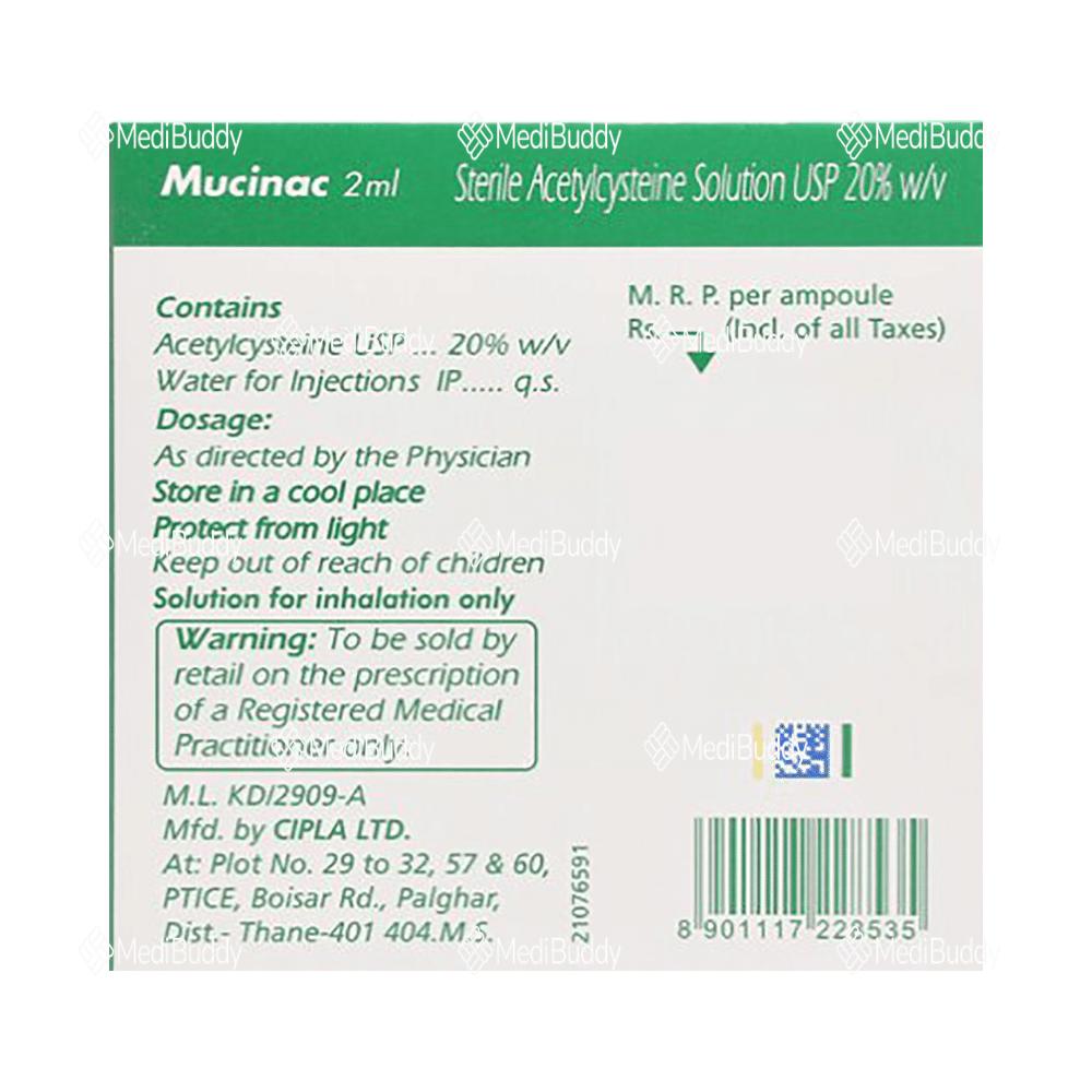 Before starting treatment with Mucinac 20% Injection, it is crucial to inform your doctor about any existing medical conditions, such as asthma, kidney disease, heart disease, or liver problems. Additionally, disclose all other medications you are currently taking, as some medications may interact with Mucinac, potentially reducing its effectiveness.
