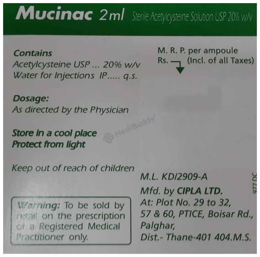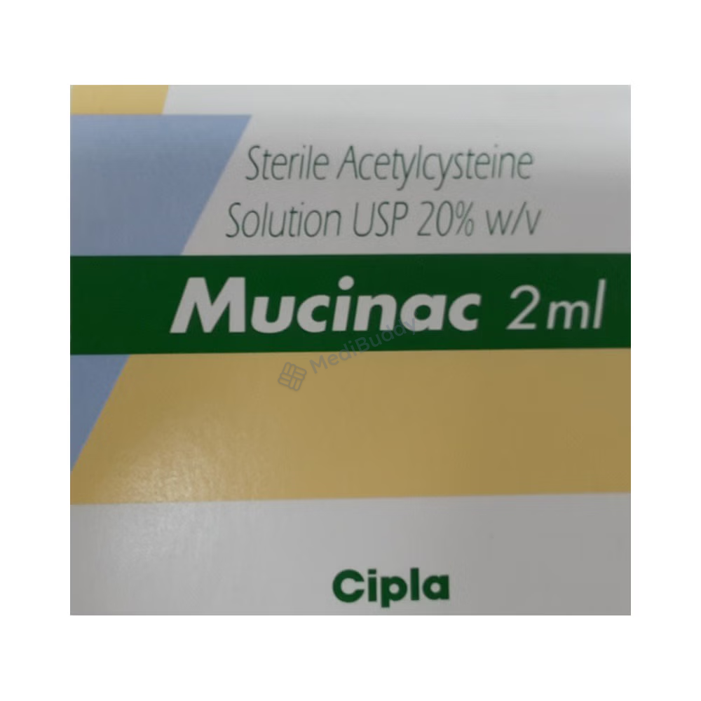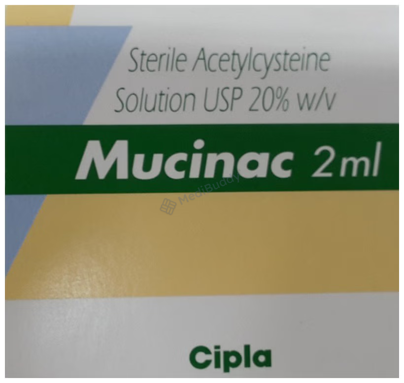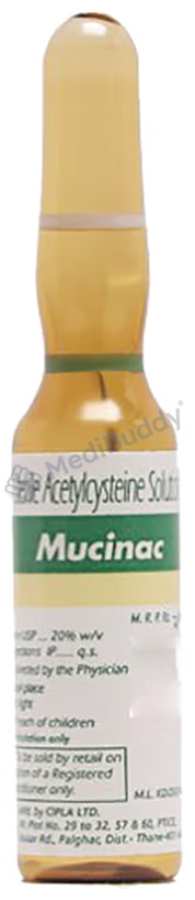 Mucinac 20% Injection is an antidote medication used to treat paracetamol overdose, which can occur when someone accidentally consumes too much paracetamol medicine, or in cases of self-harm. The medicine is crucial in protecting the liver and minimizing injury caused by the overdose. It contains Acetylcysteine, a component that plays a crucial role in restoring glutathione levels, a chemical that helps eliminate toxic substances in the body.