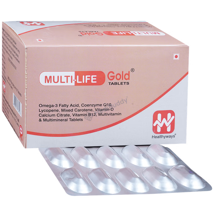 The Multi-Life Gold Tablet is a dietary supplement that combines a variety of important ingredients to provide numerous health benefits. Packed with Omega3 Fatty Acids, CoenzymeQ10, Lycopene, and other essential Multivitamins and Multiminerals, this supplement is designed to support overall well-being.